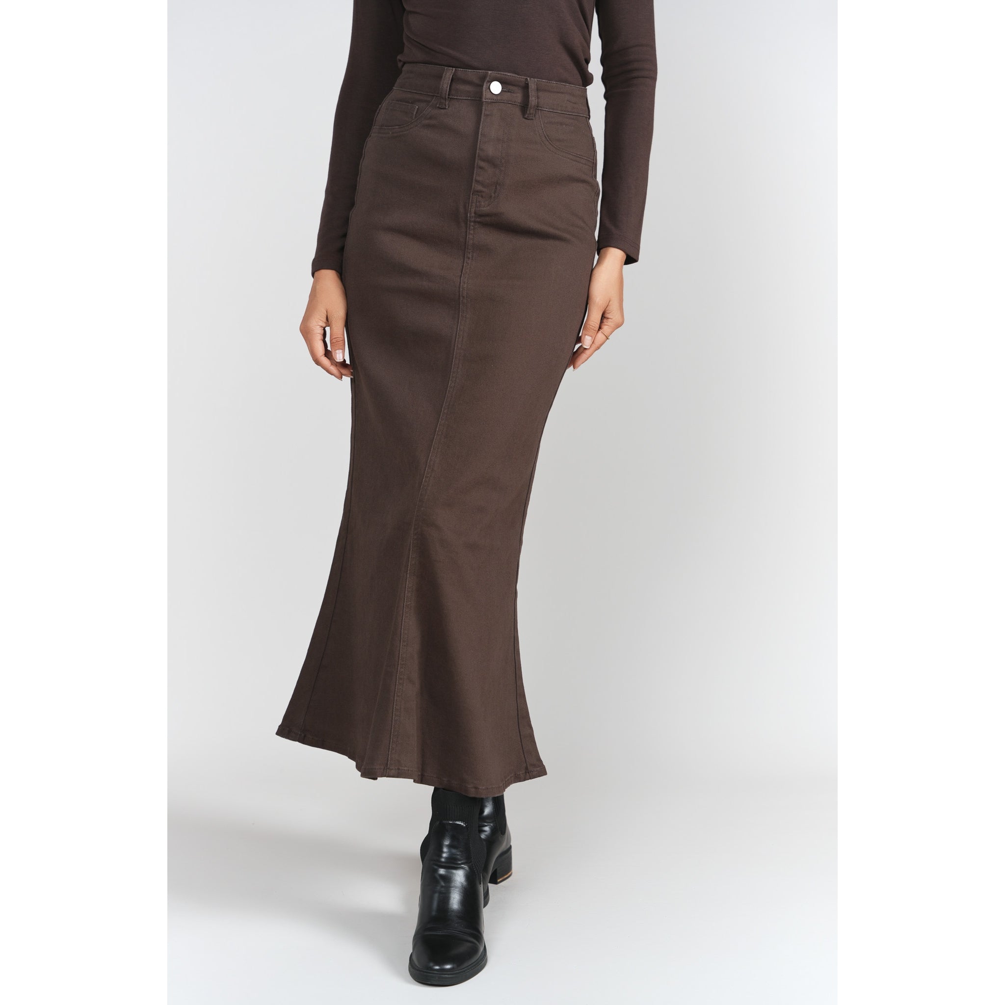 The Mermaid Denim Maxi Skirt in Brown brings a fresh twist to a classic silhouette. Designed to sculpt and flatter, this piece flows seamlessly from a fitted high waist to a graceful mermaid hem. Crafted from premium denim with a soft touch and subtle stretch, it offers both structure and comfort. The deep brown hue lends a touch of understated sophistication, making it a versatile wardrobe essential that exudes effortless elegance.