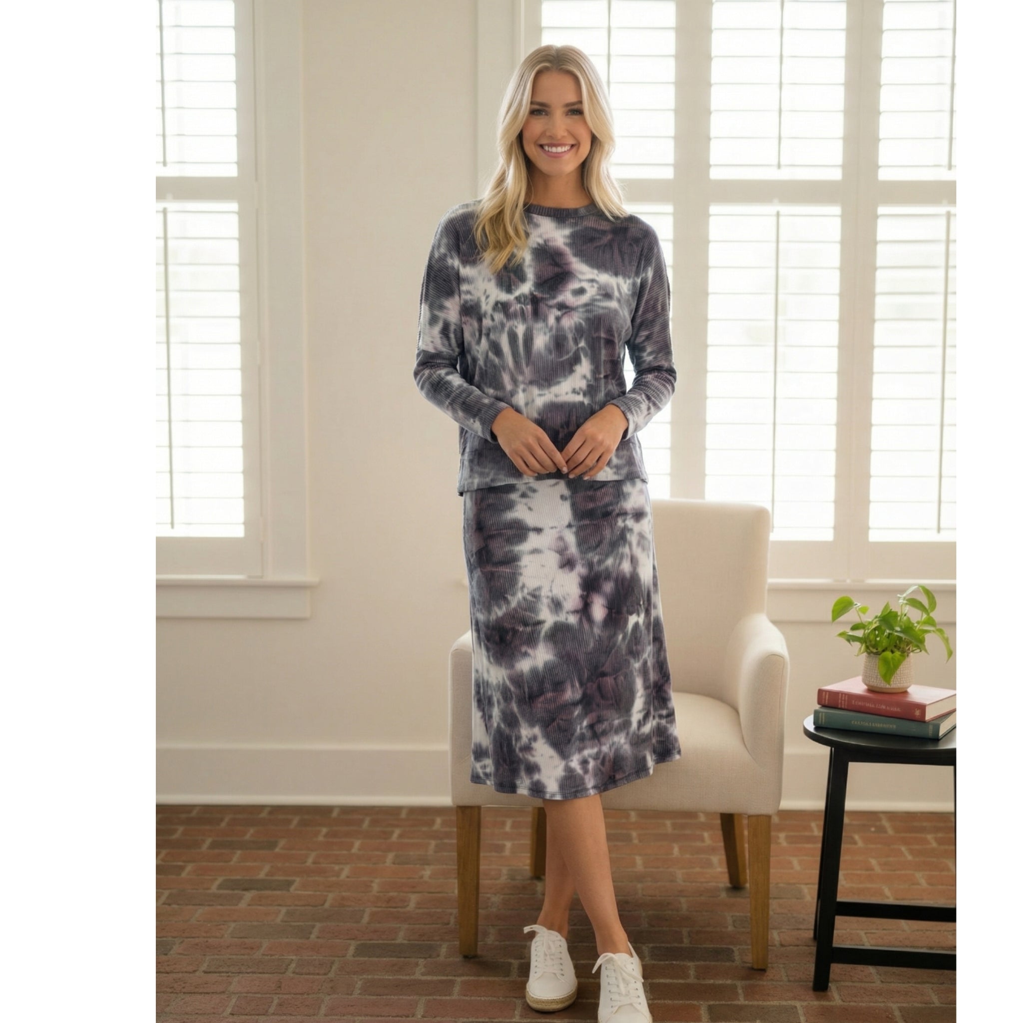 Super cute two piece set. Drop shoulder, flowey and cozy. Lots of stretch. Skirt is elastic waist and lined. 2 piece set