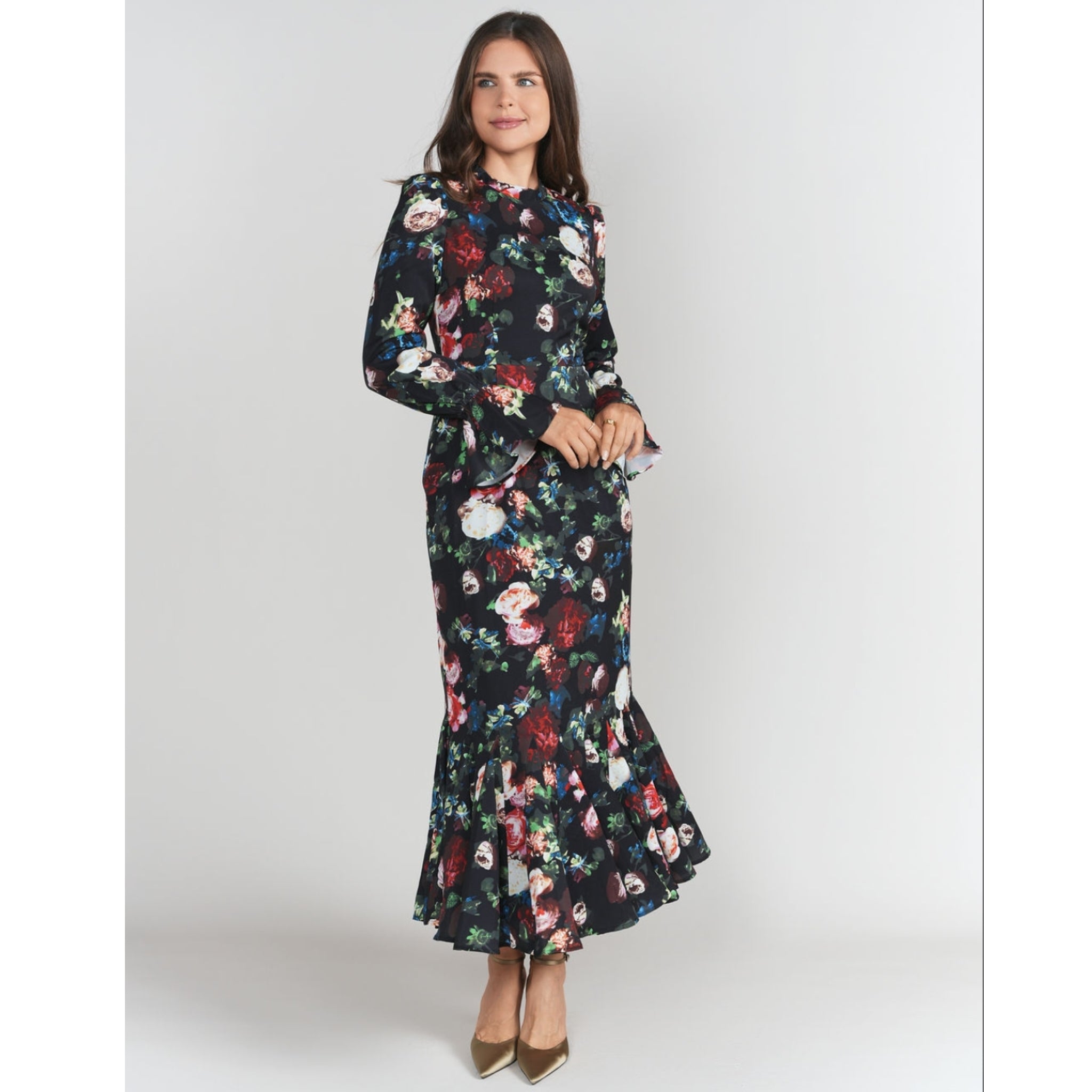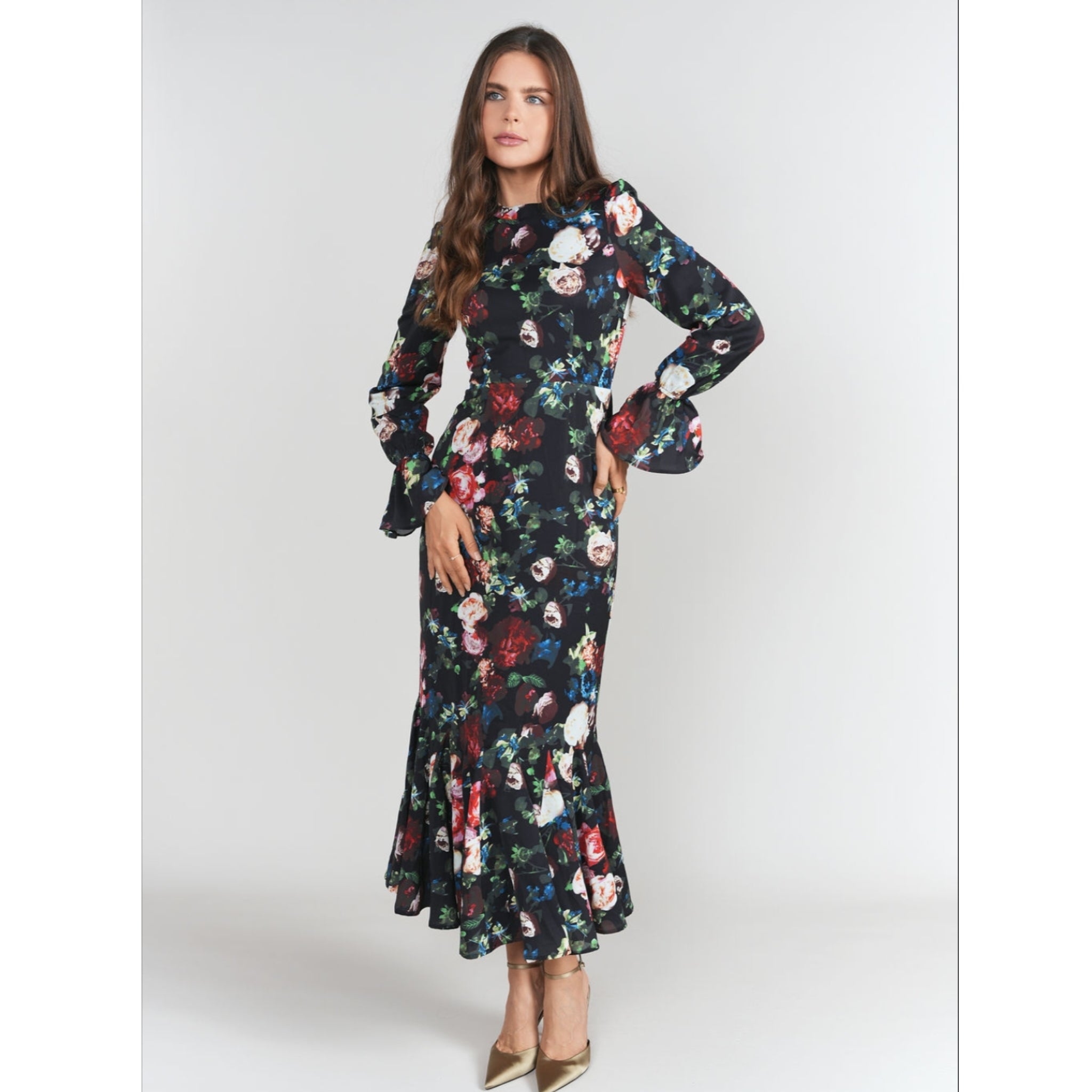 Vibrant maxi dress with lower ruffle hem and ruffle long sleeves. Satin-like fabric. Lined, back zip, no stretch.