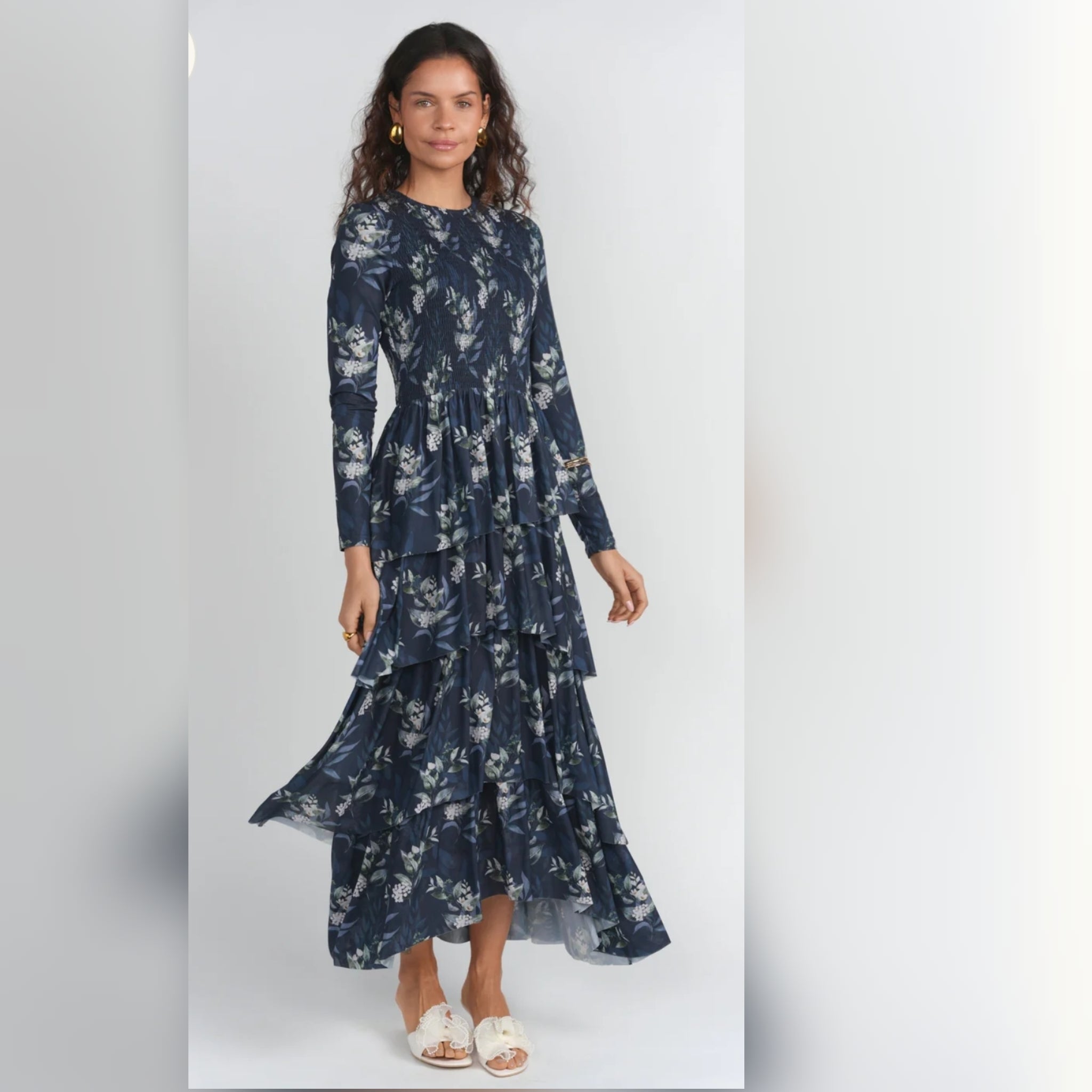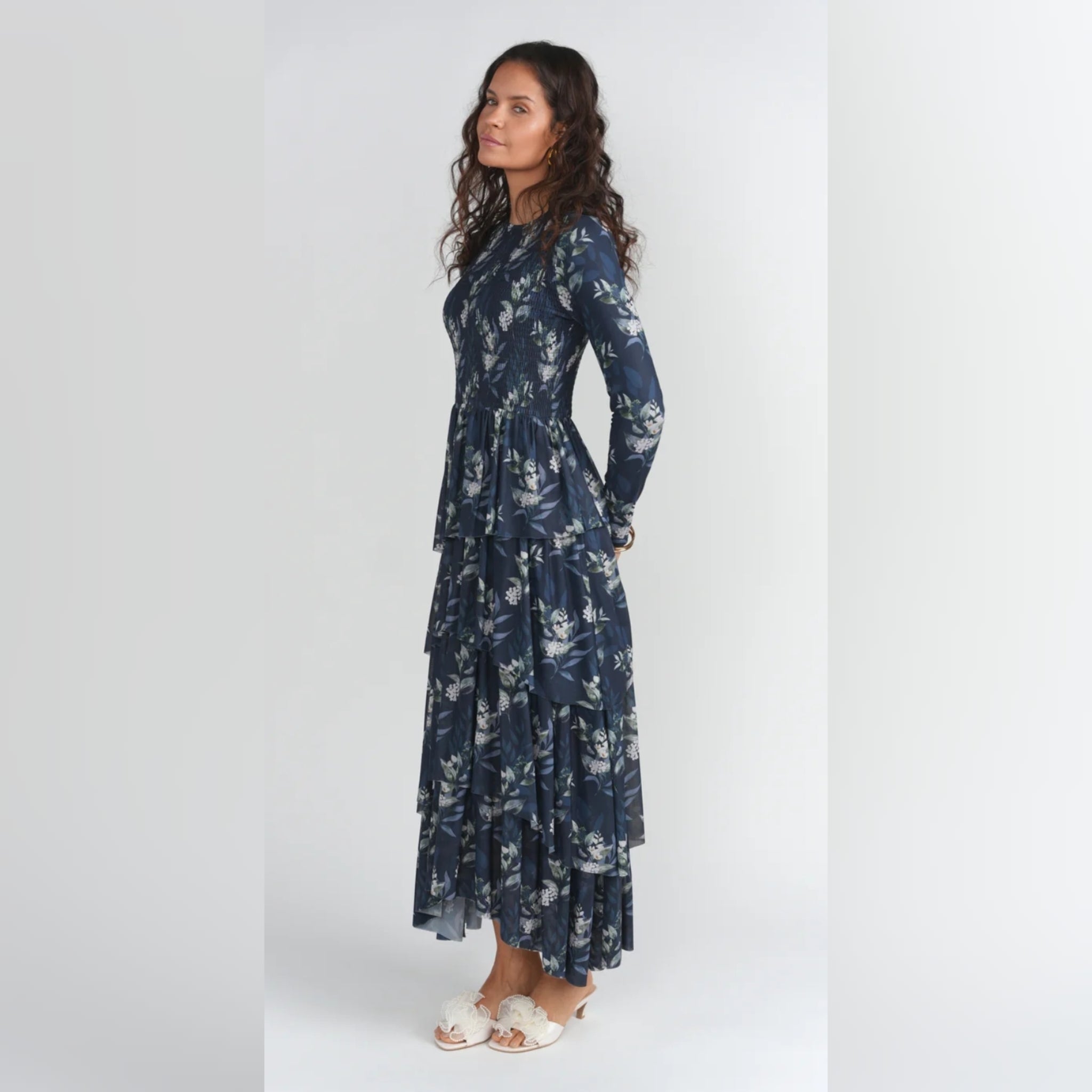 Smocked bodice with fitted sleeves and a softly tiered skirt for a flattering, comfortable fit.