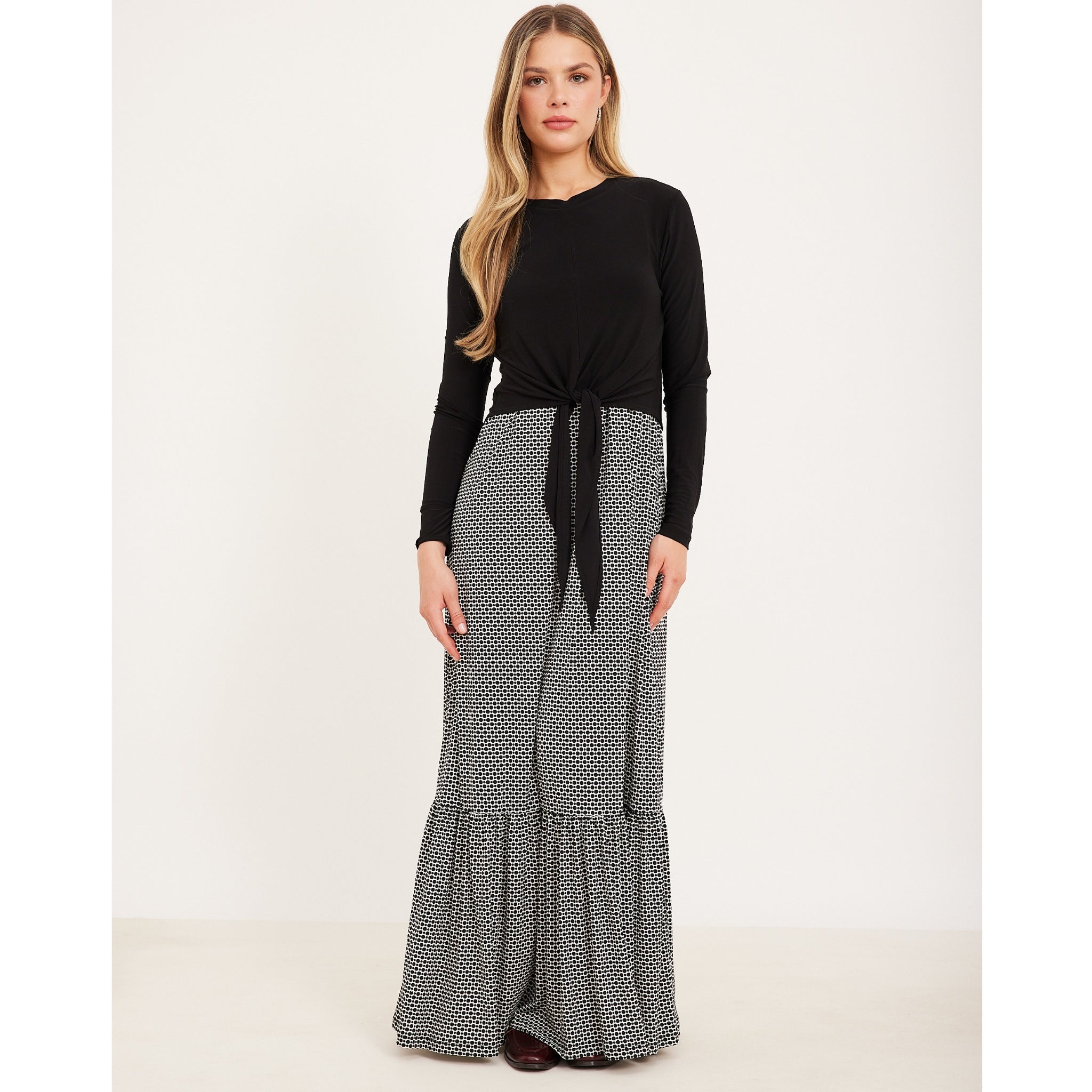 Black & White maxi dress. Black tie overlay which is nursing friendly. Back zip long sleeve. Bottom tier. Stretchy material.