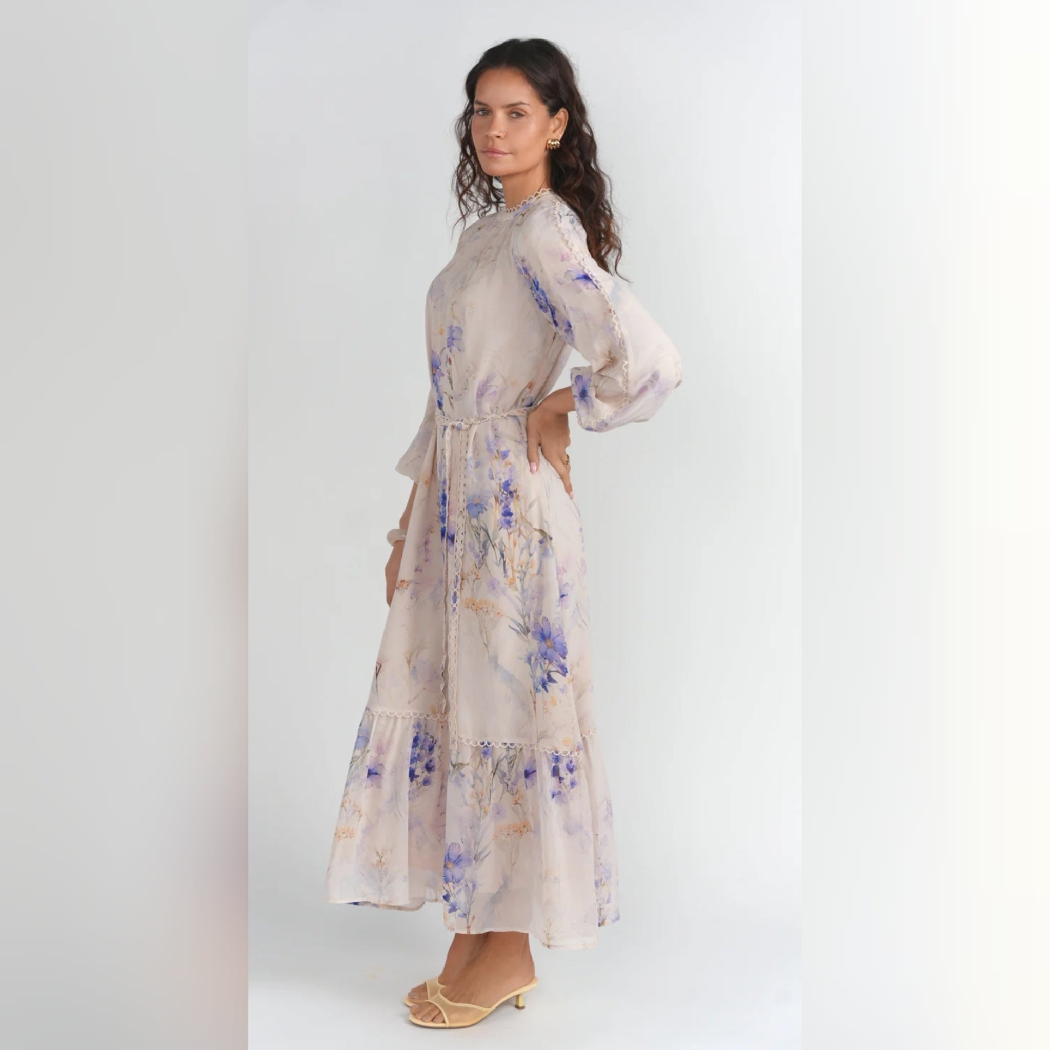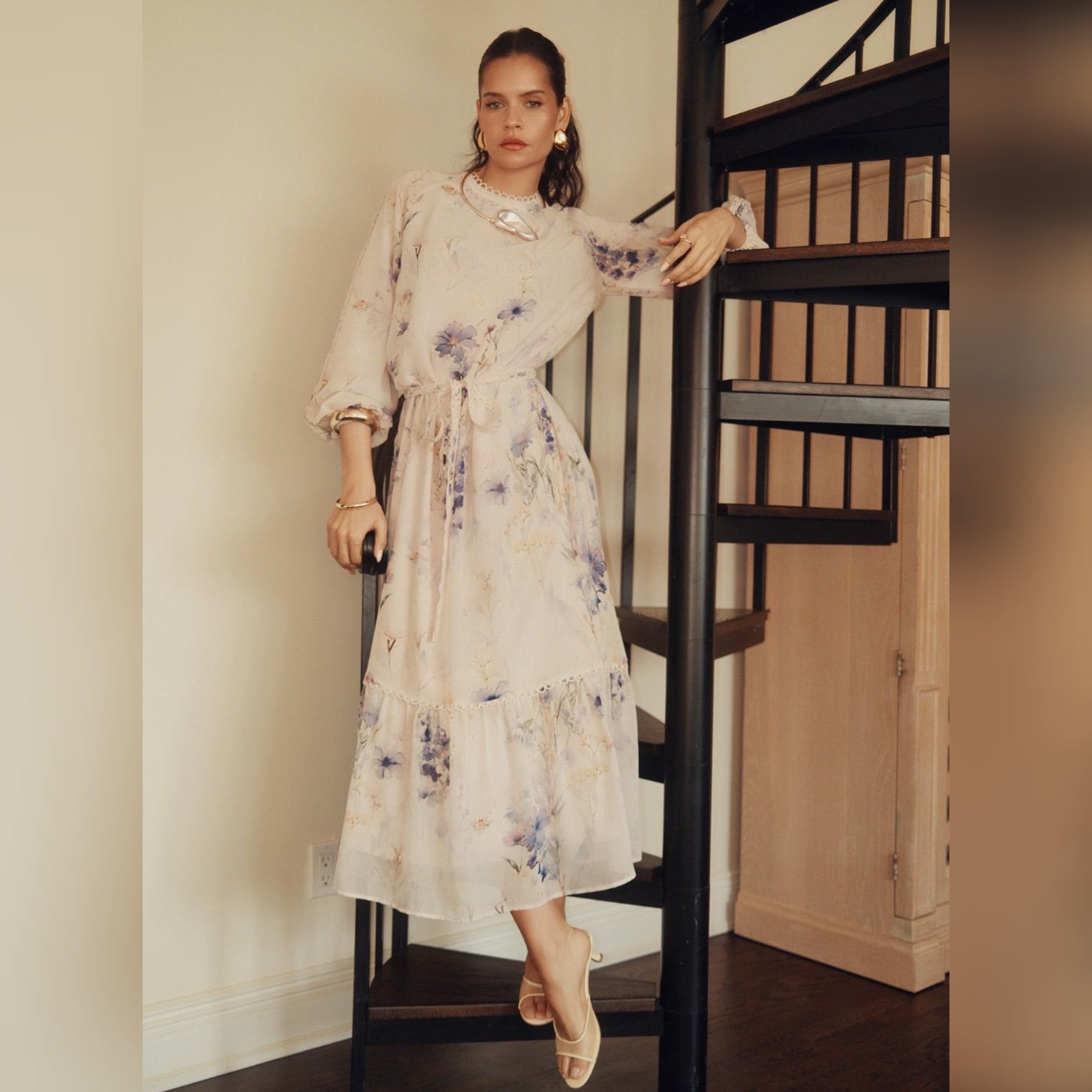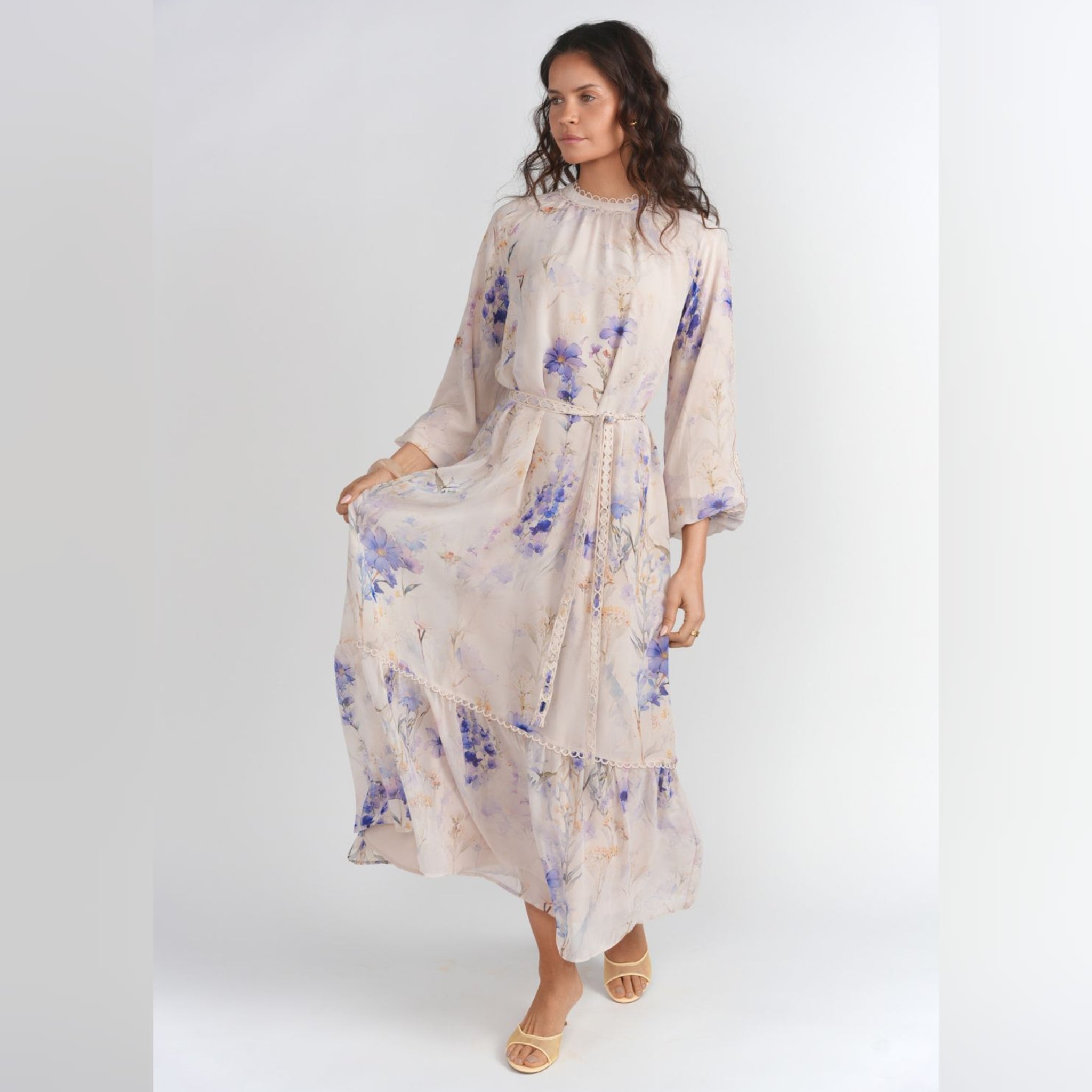 Soft and elegant, this chiffon dress is designed to make a statement with its flowing silhouette and beautiful floral print. Finished with delicate lace details throughout, it’s an effortlessly feminine piece made for special moments.