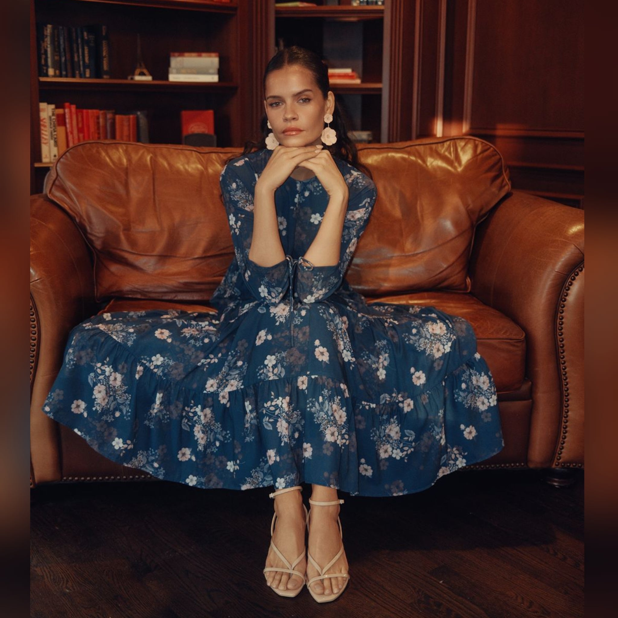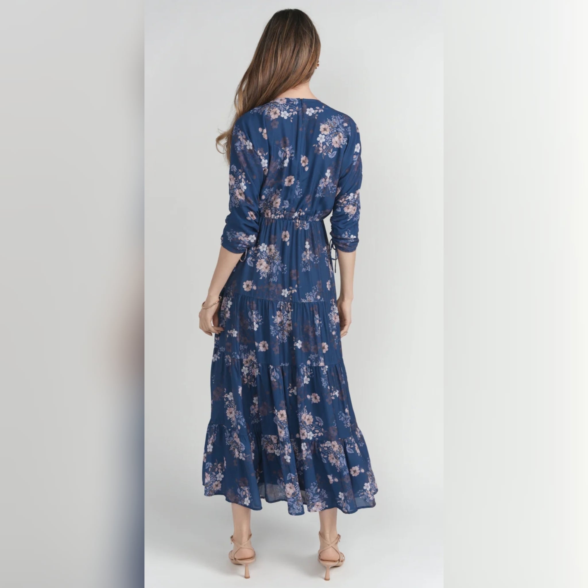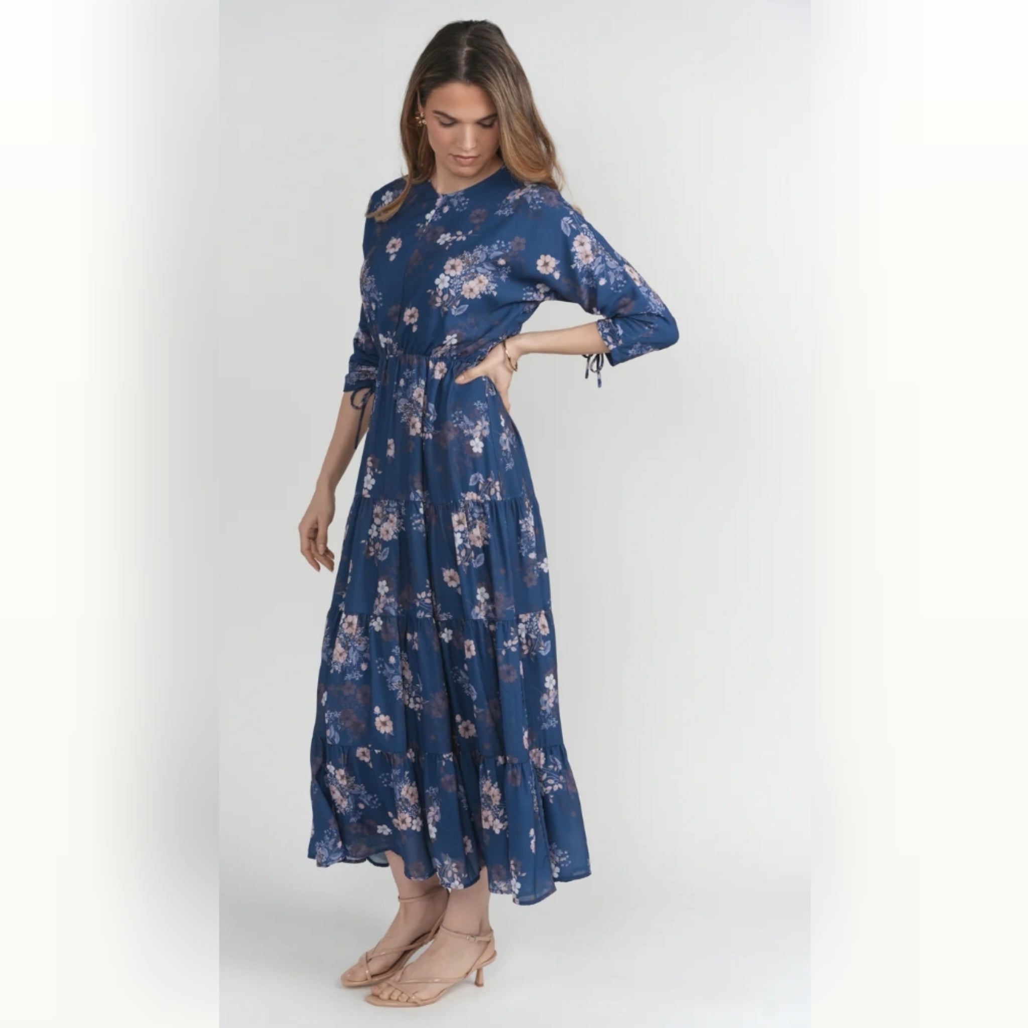 Effortless and flattering, this dress is designed with thoughtful details that elevate an easy silhouette. Featuring a modest V-neck, adjustable sleeve ties, and a tiered skirt, it offers beautiful movement with a well-shaped fit.