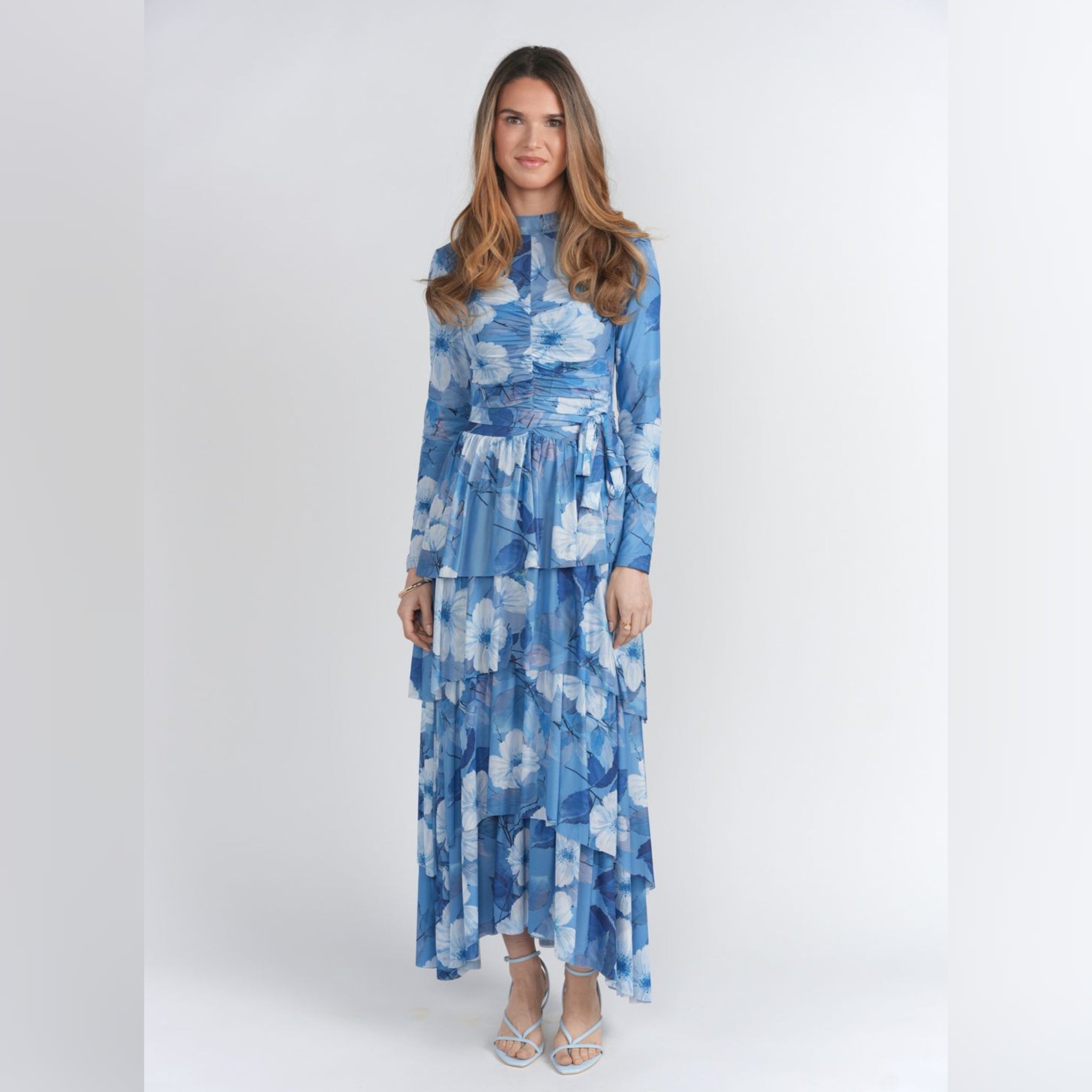 Stunning, mesh ruffle dress. Fully lined, long sleeves and pretty ruffles on skirt. Lightweight and stretchy. Very flattering with mid-chest ruching, fitted sleeves, and a softly tiered skirt, it offers that unmistakable blend of comfort and elegance that makes it a go-to for every special occasion. Made from our signature stretch mesh material.