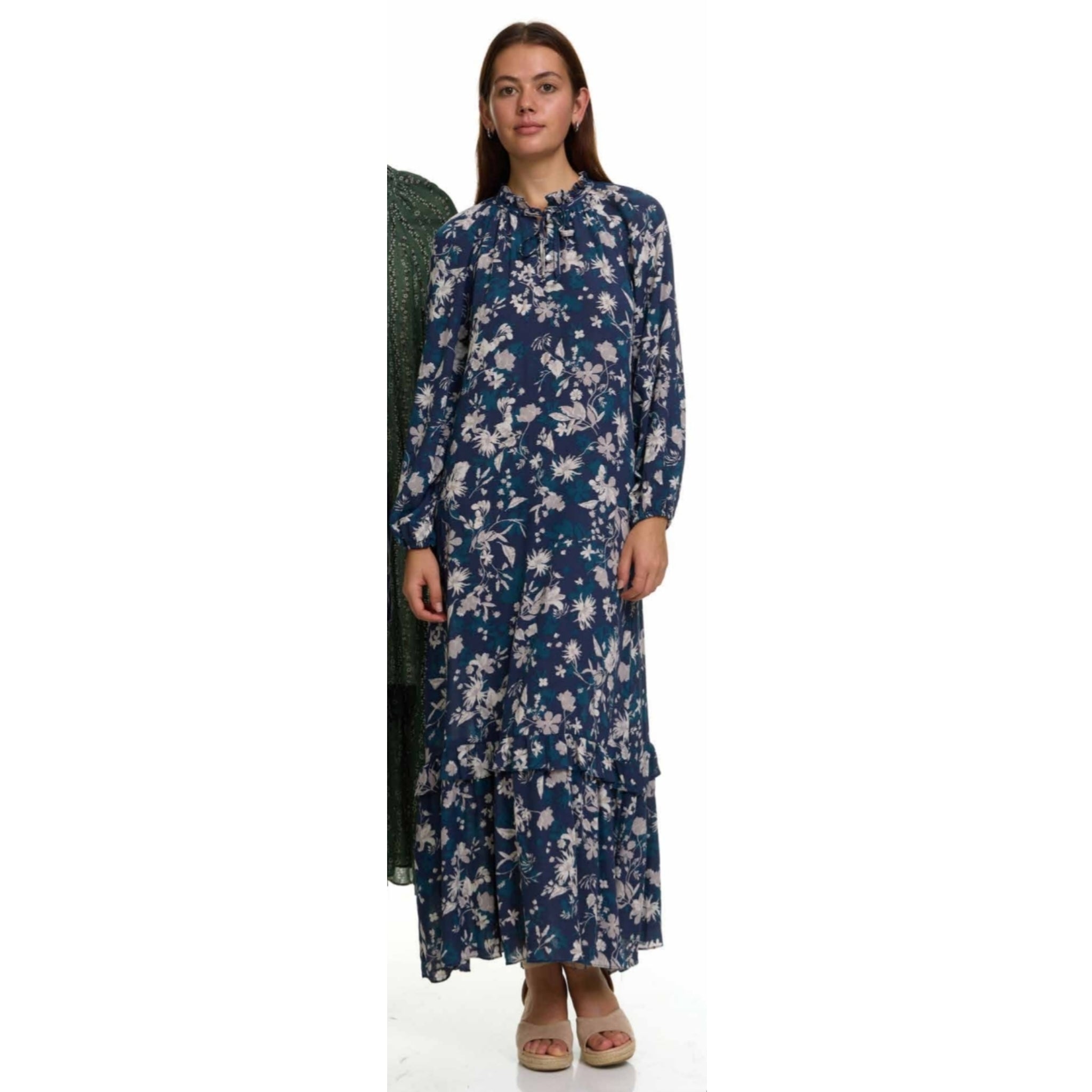 Lovely vintage printed maxi dress with tie neck and half button up closure with iridescent buttons. Long sleeve, ruffle hem, and lightweight. No waist and unlined. Tiered bottom. Material is lightweight, loose fitting, and thin. Has collar detail. Japparel