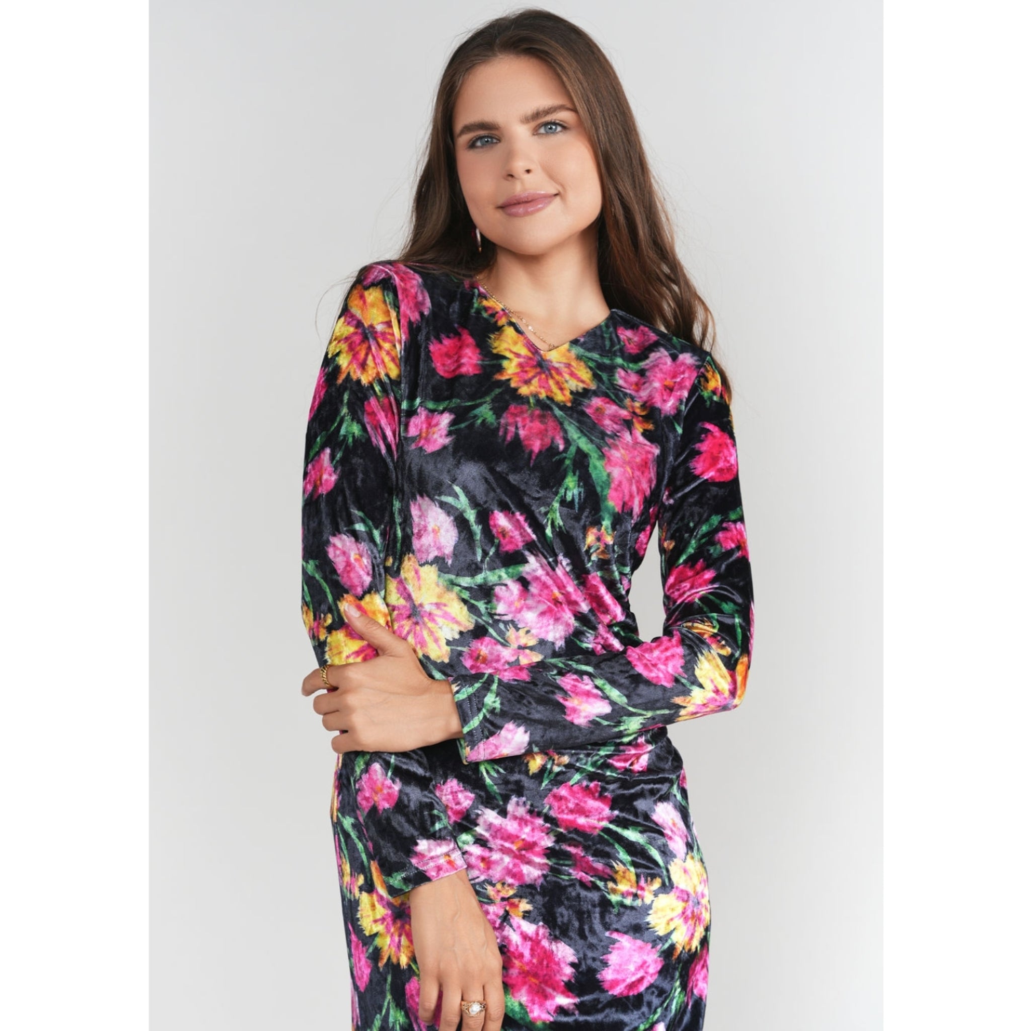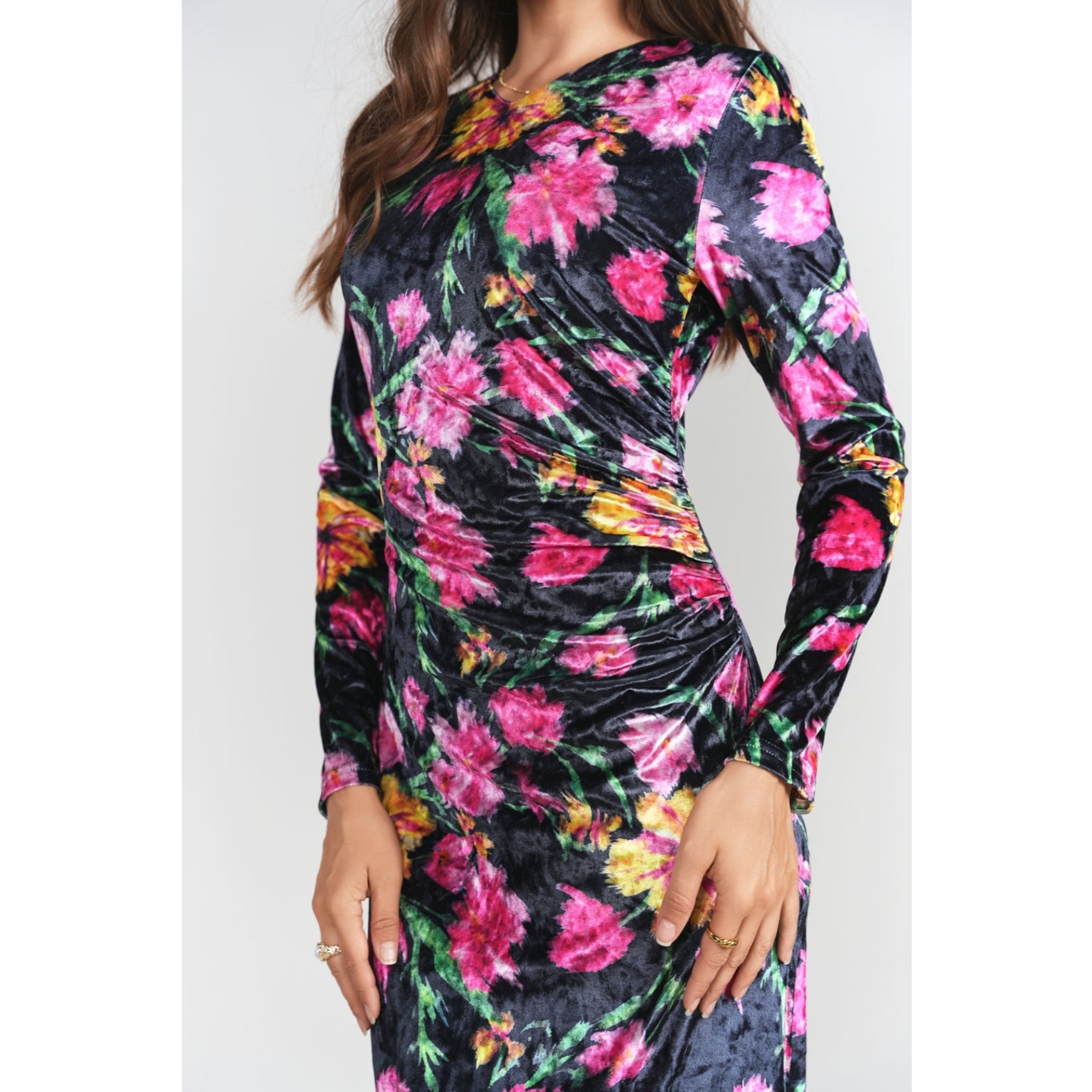 Beautiful printed velvet maxi with very flattering side ruching. Lined, long sleevs, v neck, stretchy