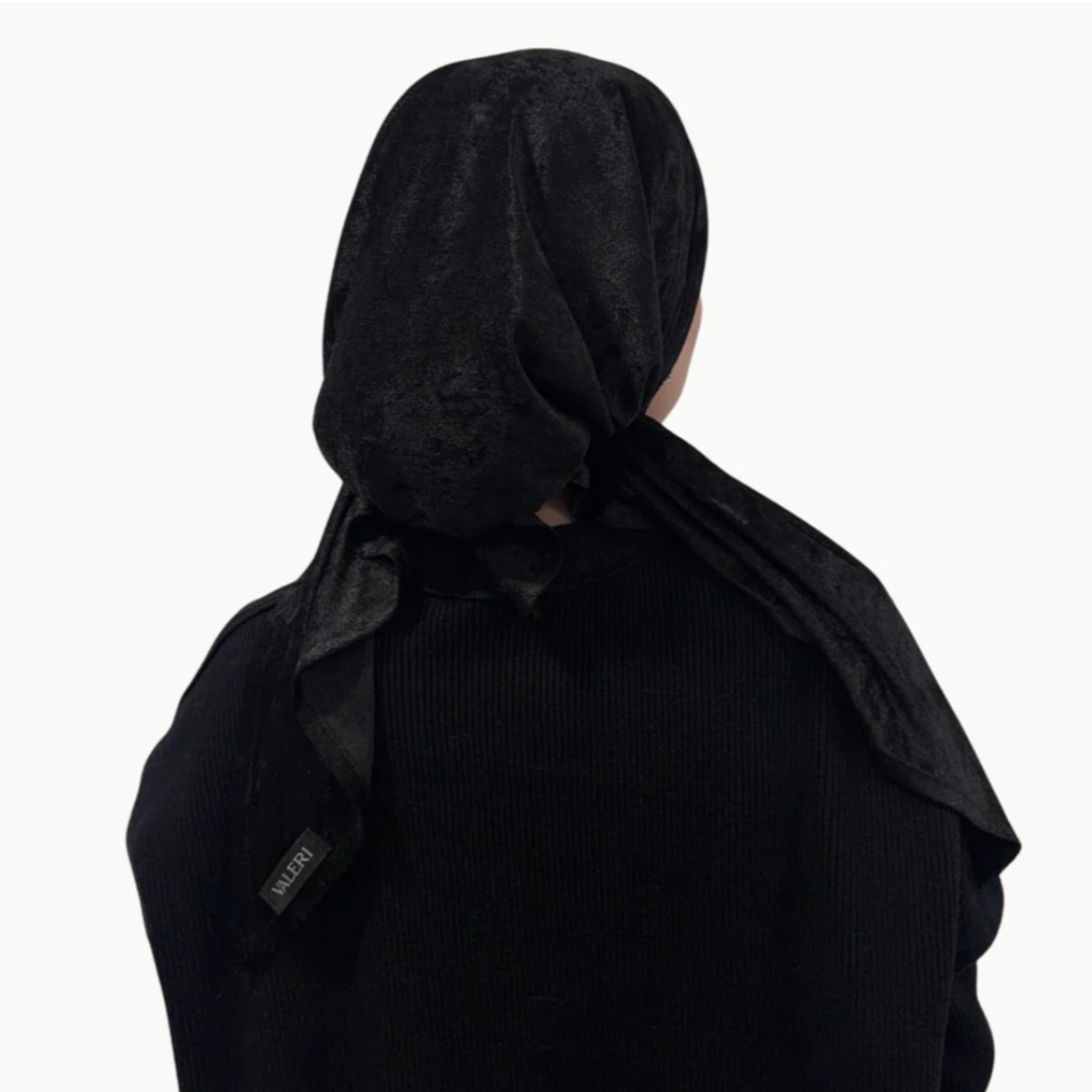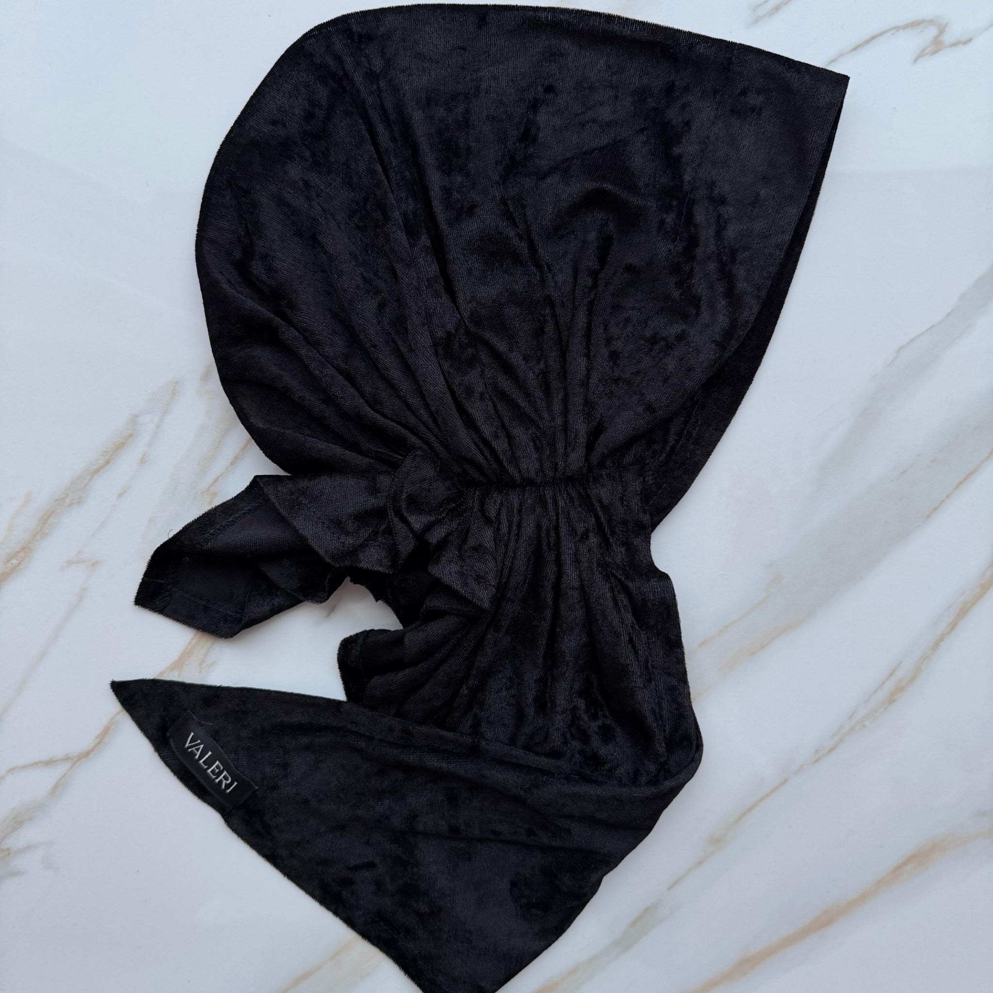 The inner elastic band that secures the pre-tied scarf measures approximately 5.5-6" long.