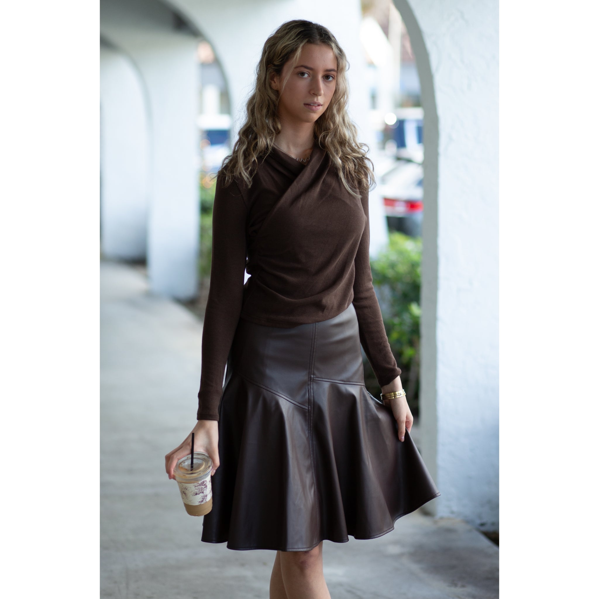 Side zip, no stretch, drop waist. Pleather material on the outside, with a soft fabric inside, perfect for extra warmth in the fall/winter, plus an extra lining to prevent static. Runs true to size.