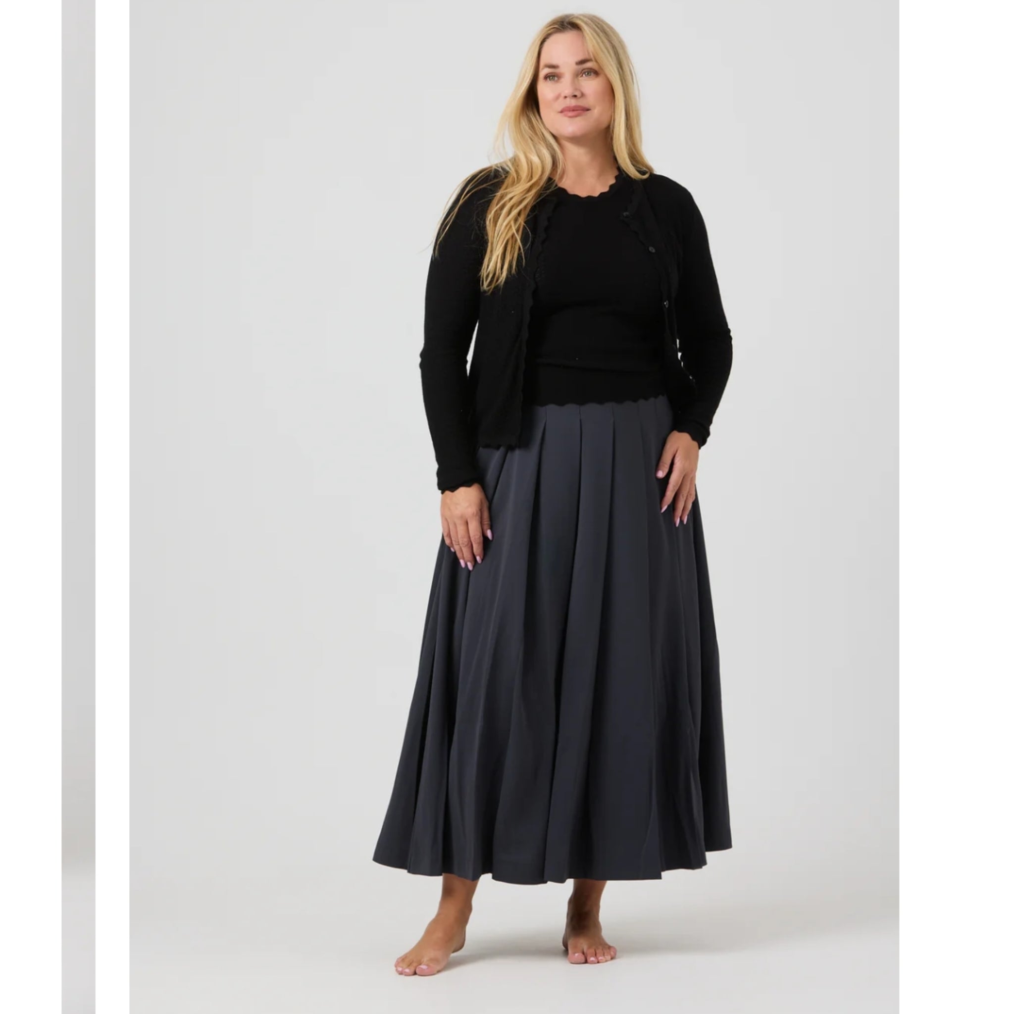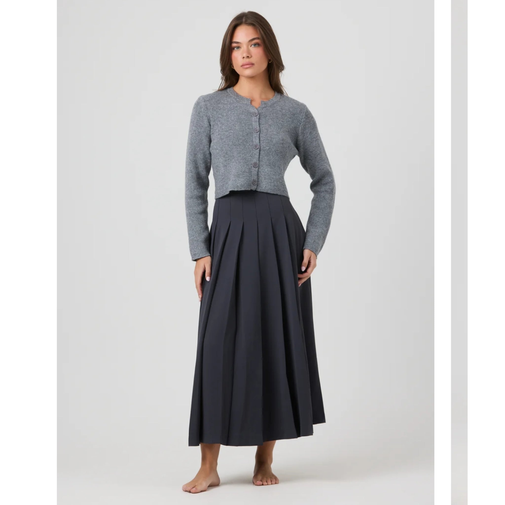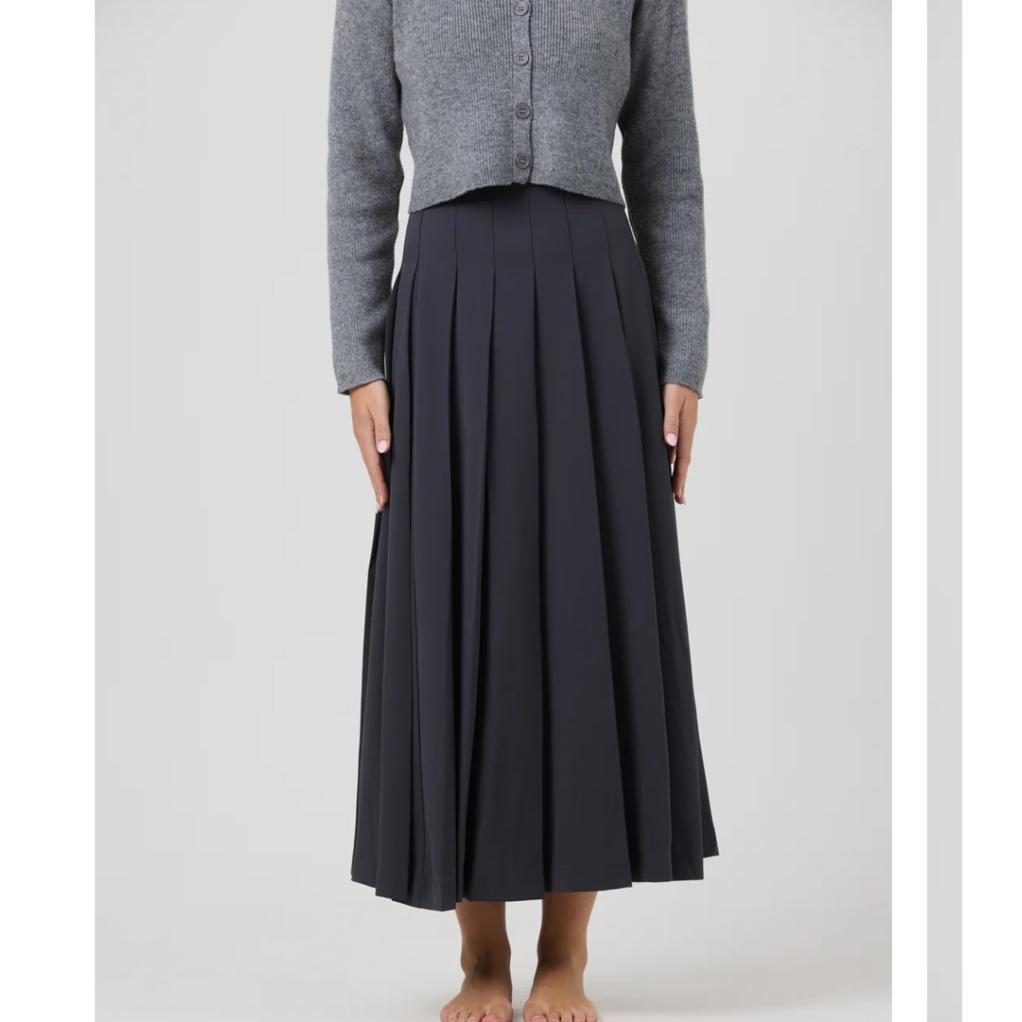 Elevate your everyday look with this chic charcoal pleated A-line skirt. Designed with soft, flowing pleats that create movement and elegance, this skirt offers a timeless silhouette that flatters every figure. The high-waisted fit provides a polished, tailored look, while the lightweight fabric ensures comfort and versatility. Side zip, no stretch.