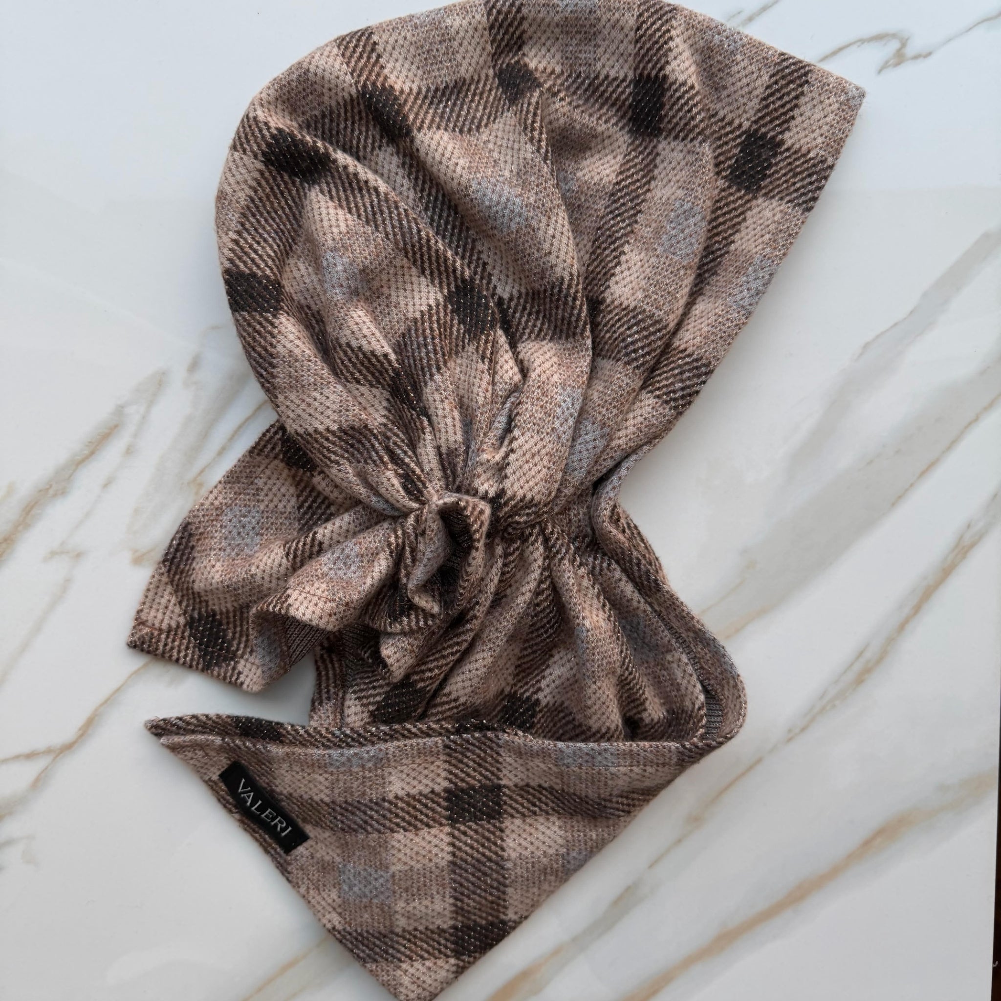 A beautifully woven plaid knit set on a warm beige background, featuring soft brown and muted blue tones with a subtle gold shimmer woven throughout. This fabric has a thicker, cozy weight with a soft feel, making it ideal for cooler days and added warmth. While comfortable, it is on the heavier side and may not be the best choice for those who are highly sensitive to thicker fabrics. Velvet headband sewn inside.