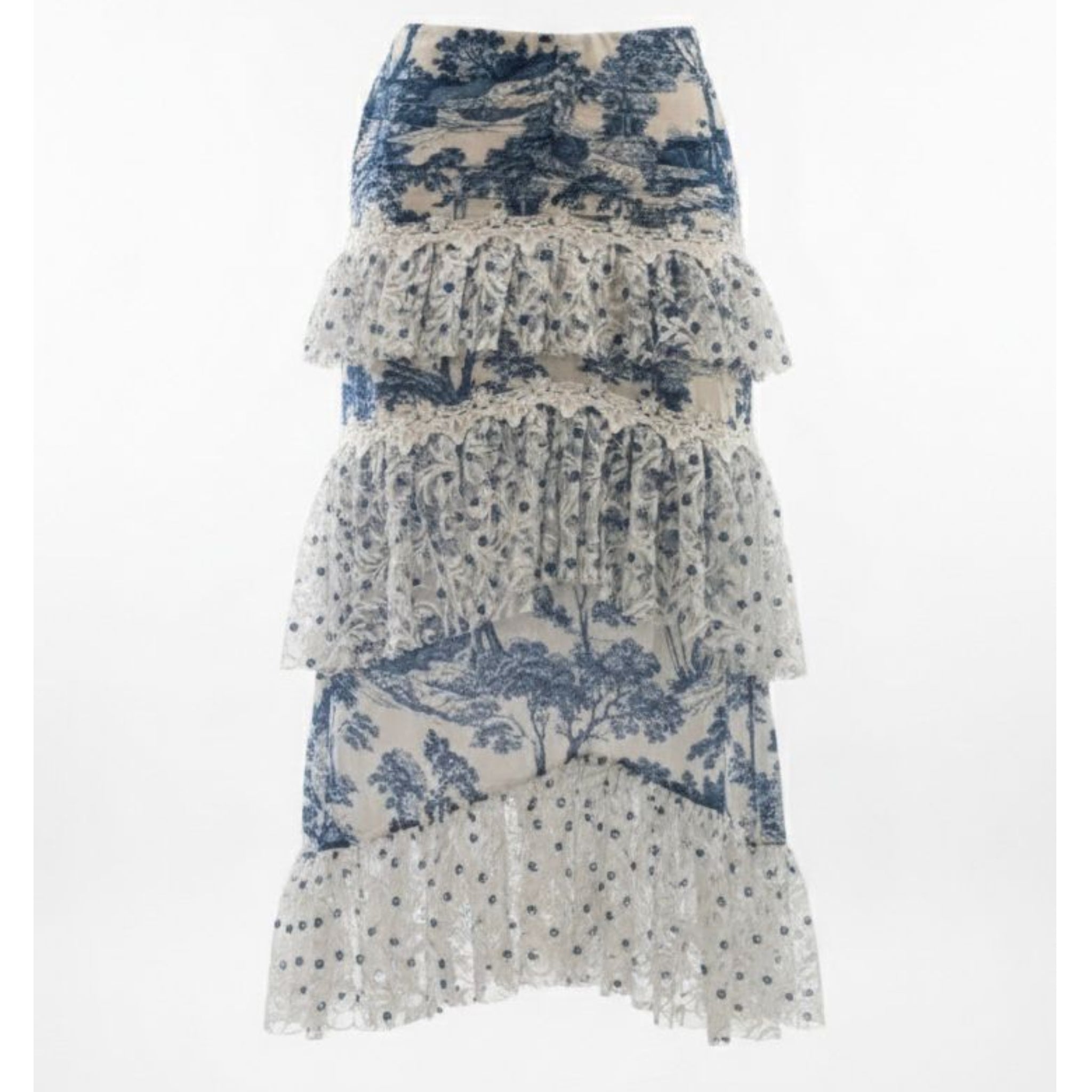 High low unique mesh layered skirt with center ruching at the waist. Toile with lace detailing. Side zip, lined.