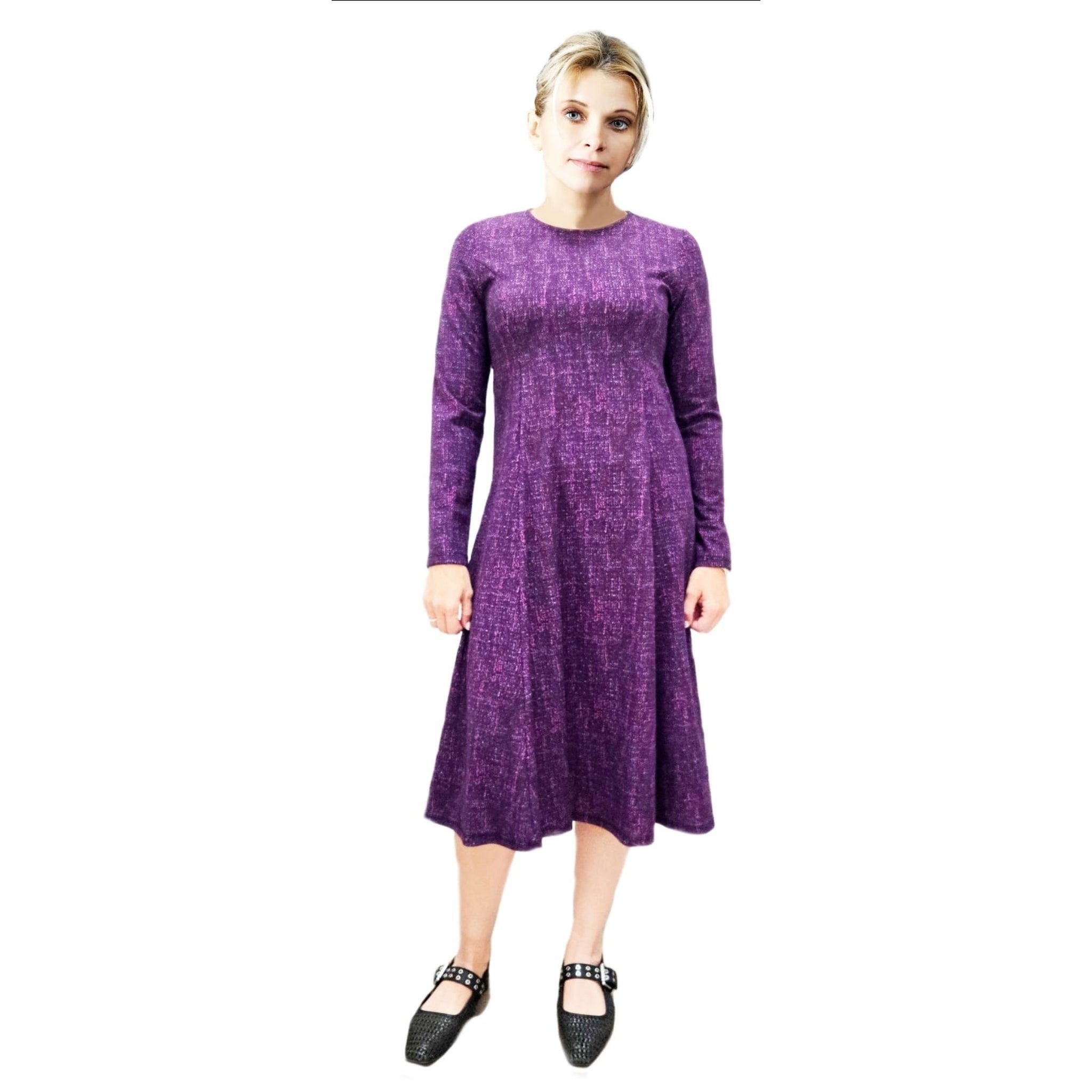 Purple printed long sleeve dress. No waist, flattering slip on dress. Unlined.