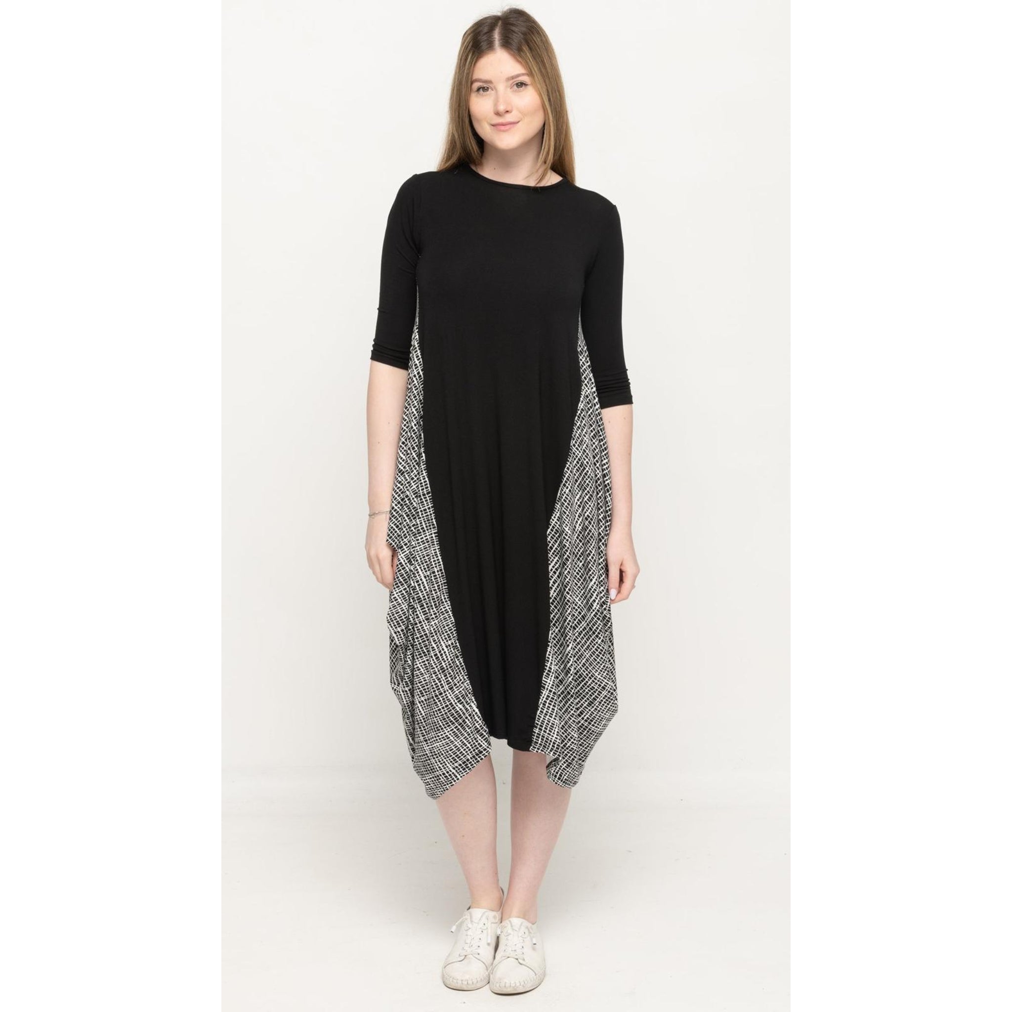 Classy solid color bo ho KMW dress in solid colors with printed side insert. Flattering, true to size, 3/4 sleeves in soft cotton like colors. Maternity Friendly. Squiggly line print insert