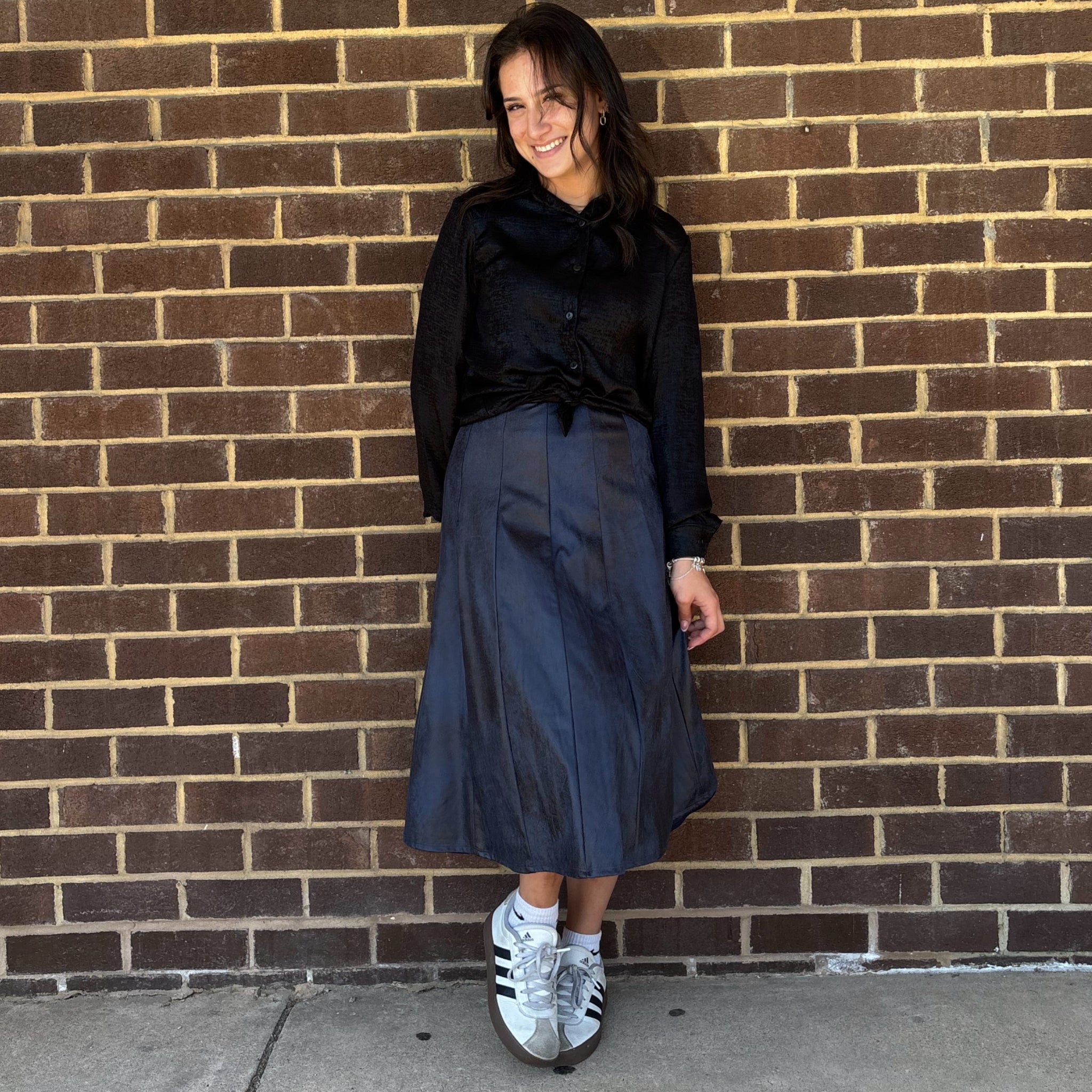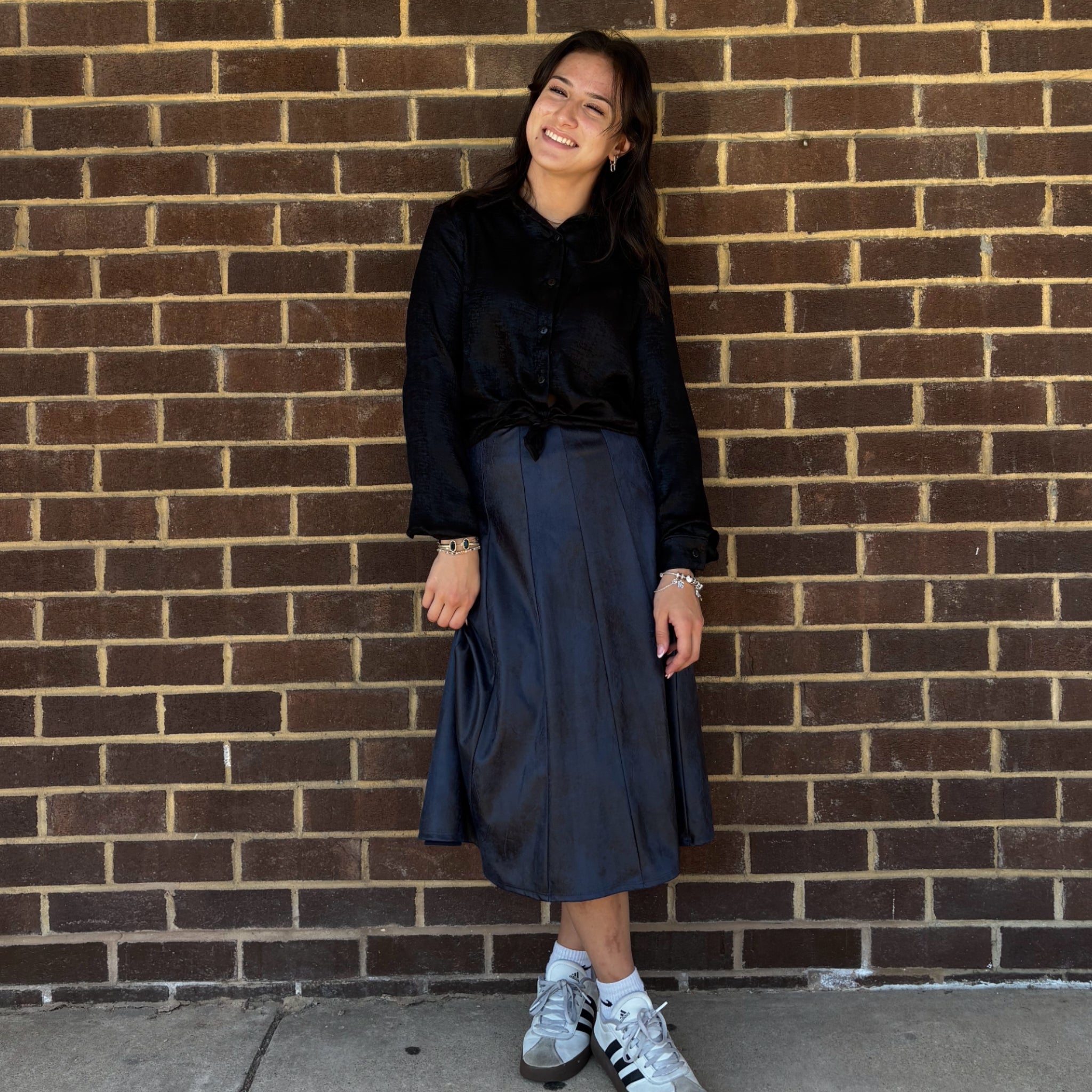 Navy panel skirt in burnout leather fabric. Fully lined.