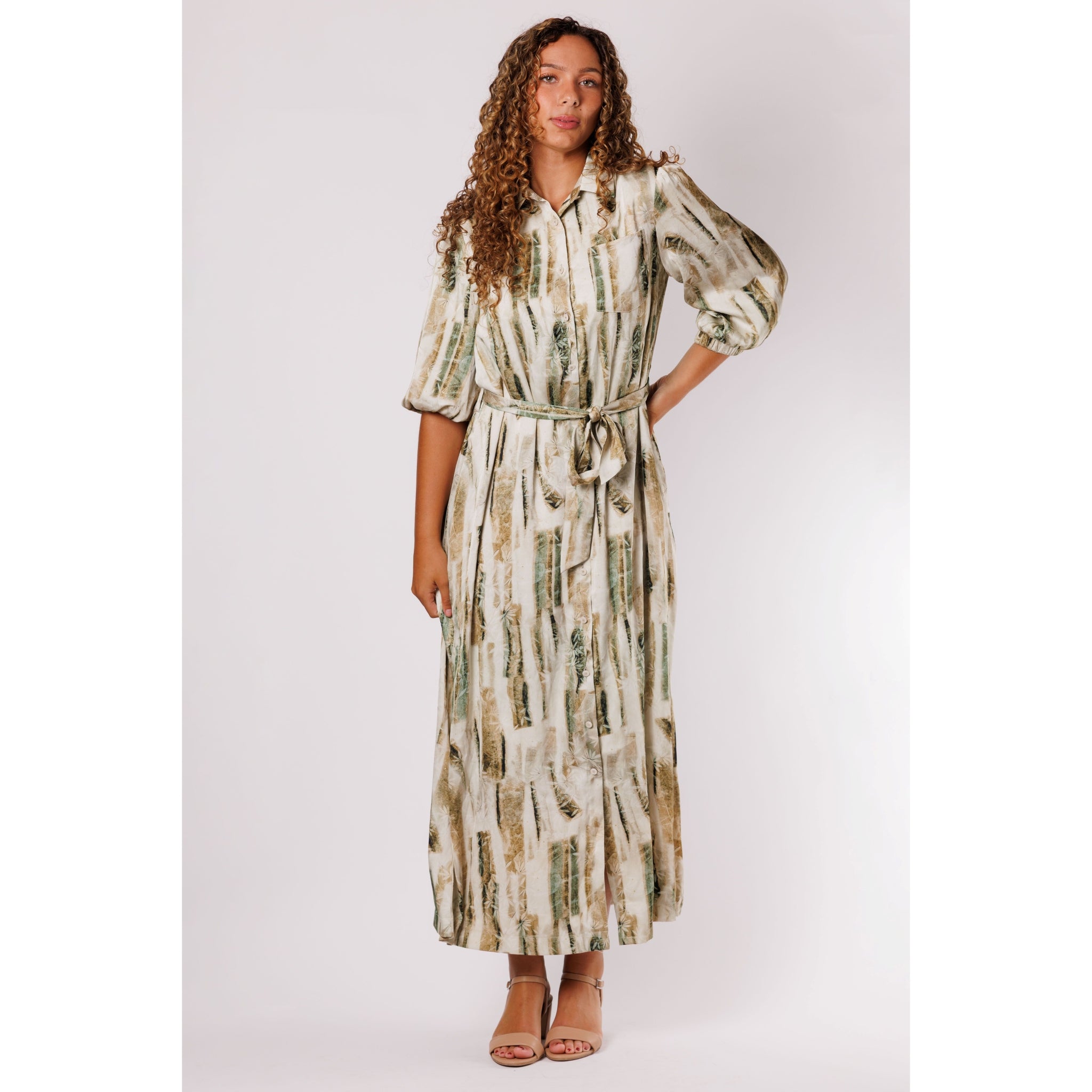 Gorgeous shirt dress! Chic collared neckline and pretty buttons down the front for nursing convenience. Beautiful print with sparkle detailing.  Bust pocket and 3/4 puff sleeves. Plus, it comes with lining for added comfort and coverage. Belt included as supplies lasts. Elevate your wardrobe with this versatile and elegant piece!