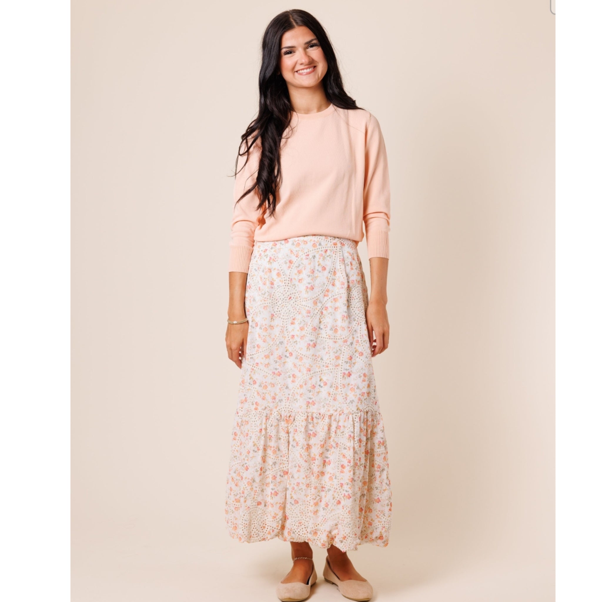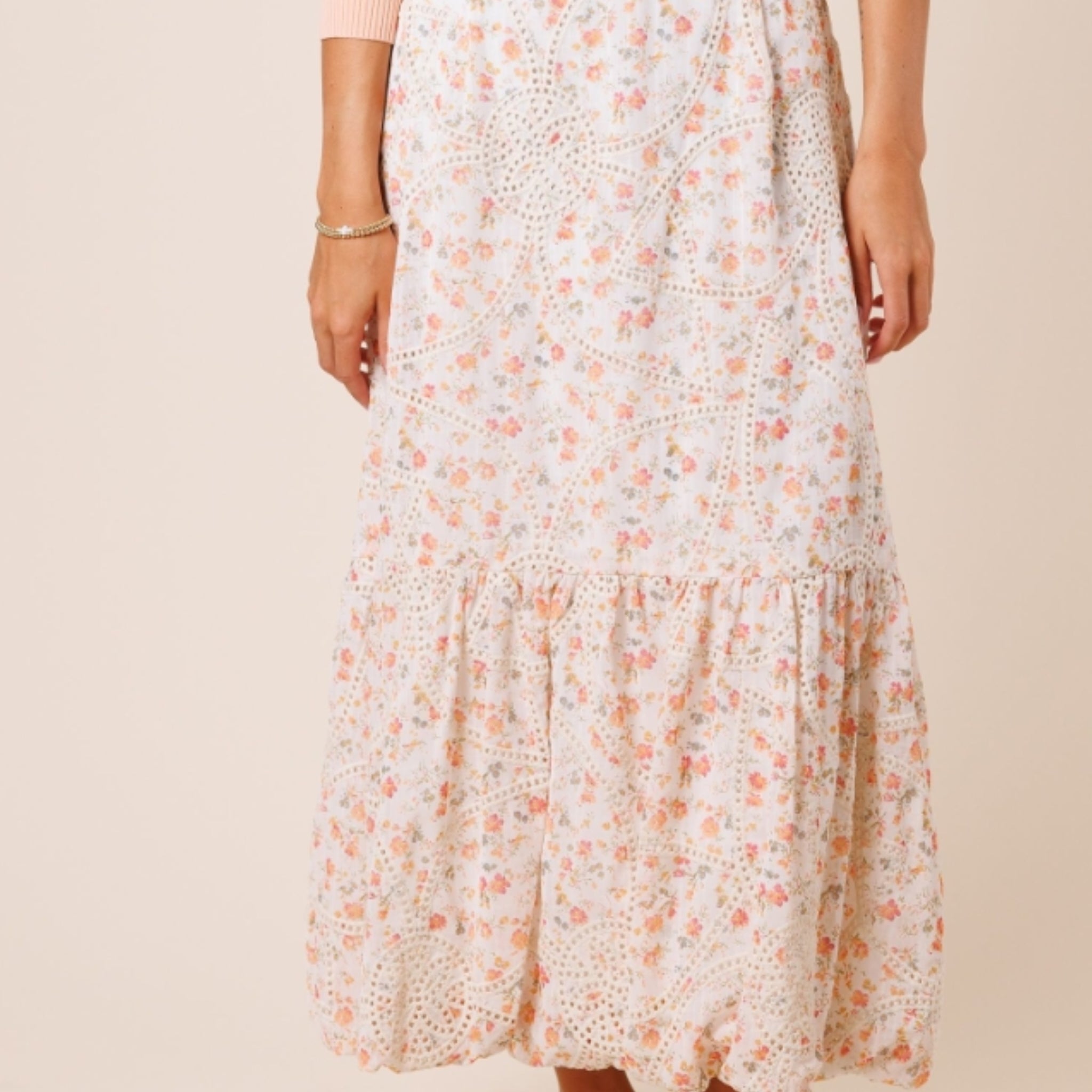 Gorgeous floral printed skirt. Bubble bottom. Side zip. Attached lining bottom tier. Gorgeous eyelet like trim detailing