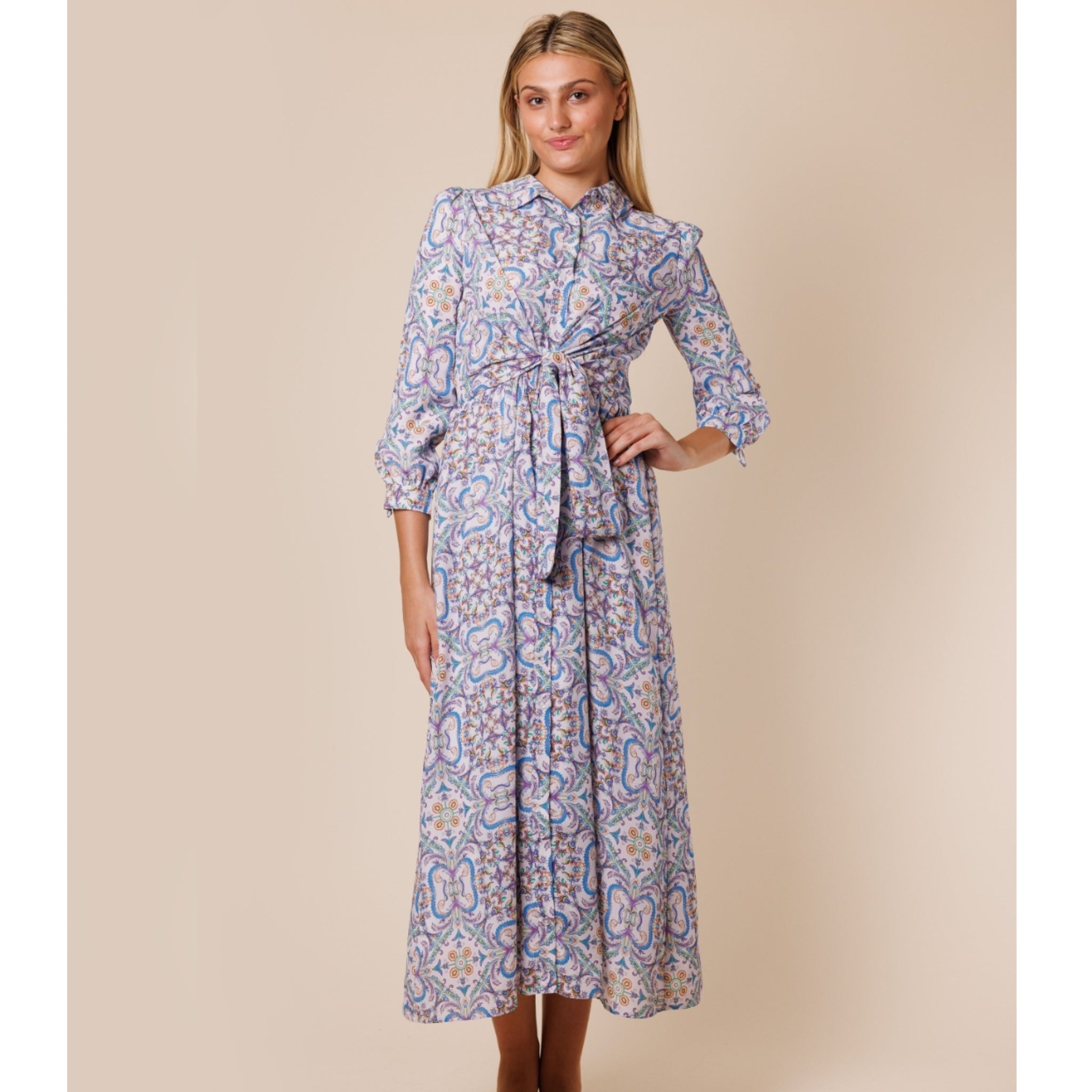 Purple Paisley print shirt dress. Buttons till waistline which has a wrap tie waist. Long cuffed sleeves. Collar. Top two buttons are functional and there is a back zip. Lined.