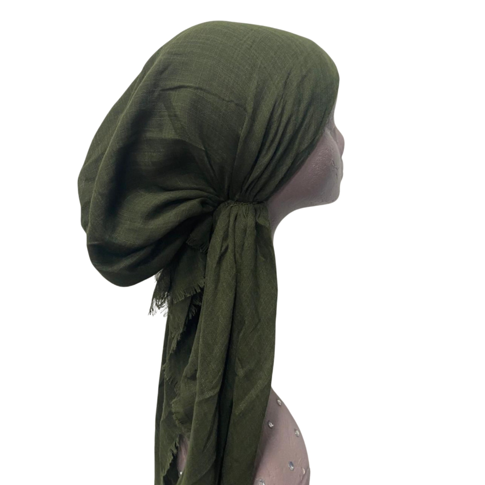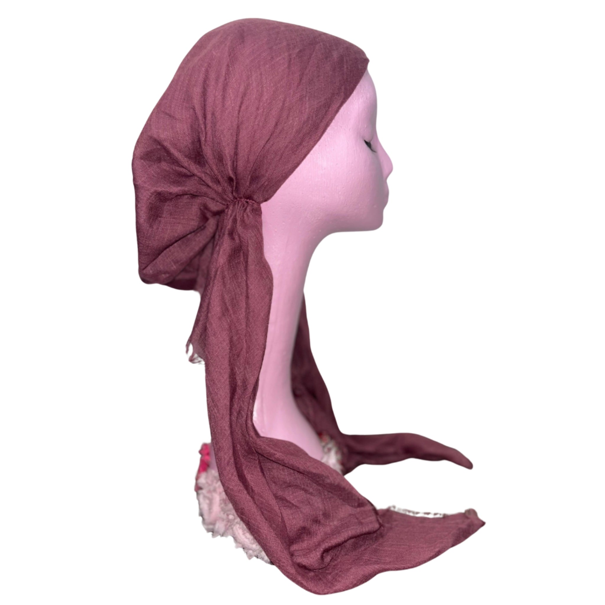 Soft, gauzy lightweight tichels. Pretied form with long tails. Nonslip velvet sewn inside