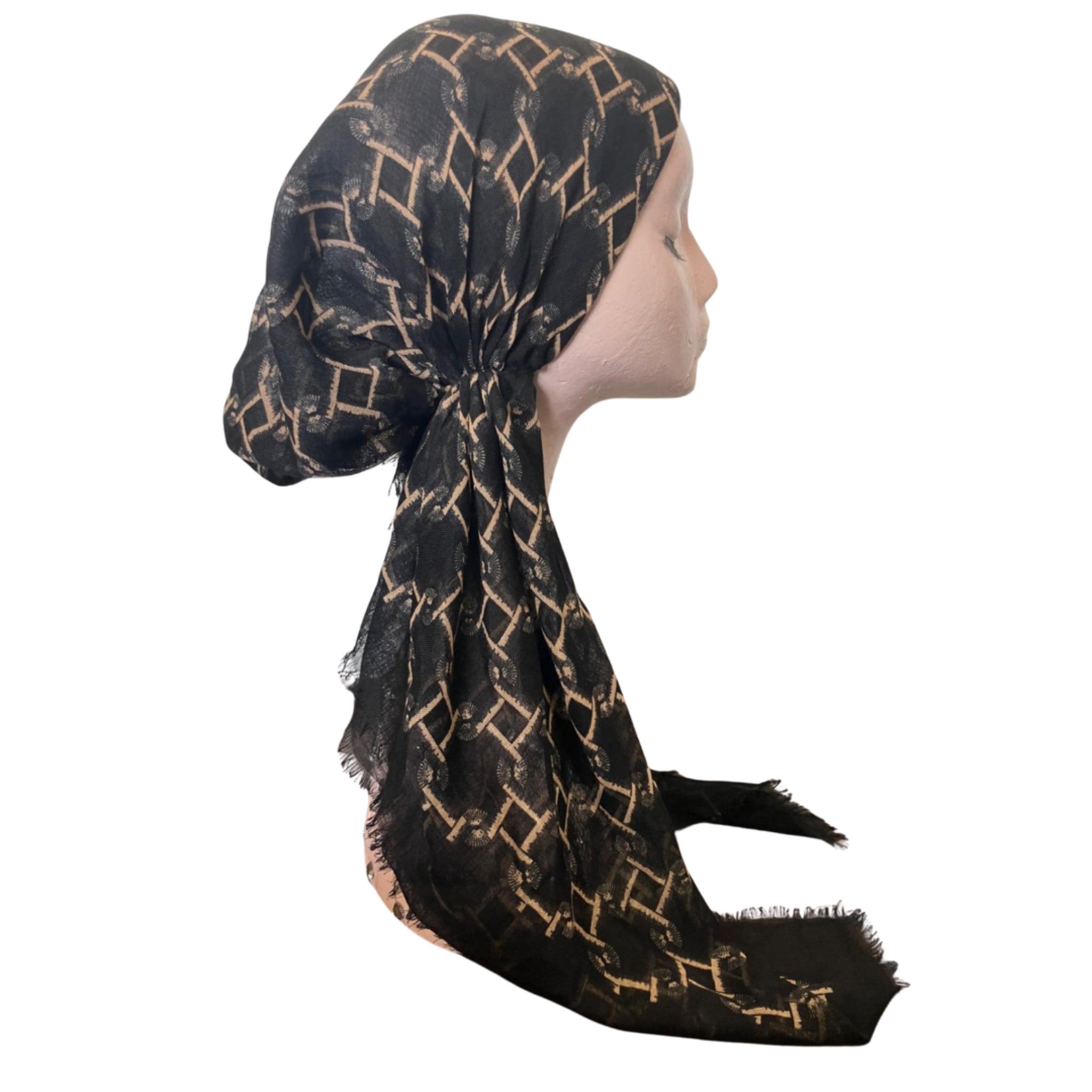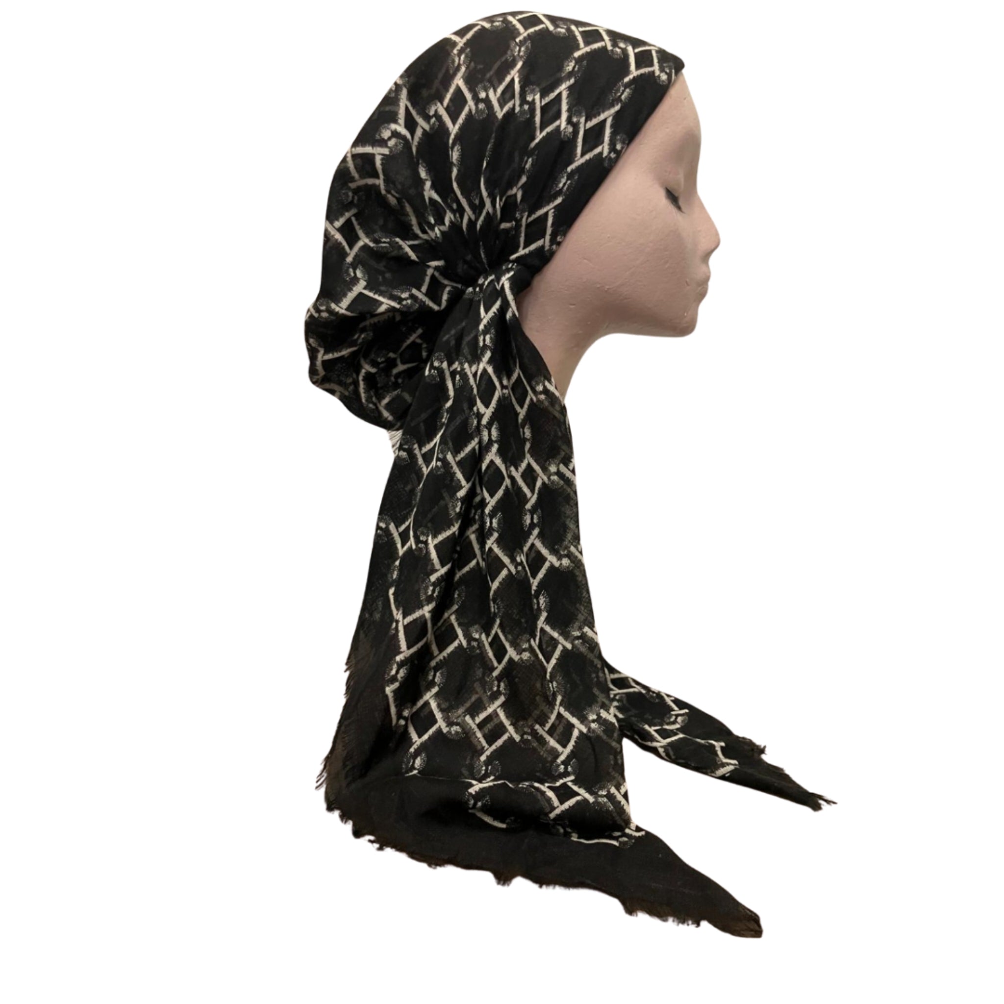 Pre-tied headscarf.  Nonslip band sewn inside.  Tie tails for firmer fit. One size fits most. Adjustable