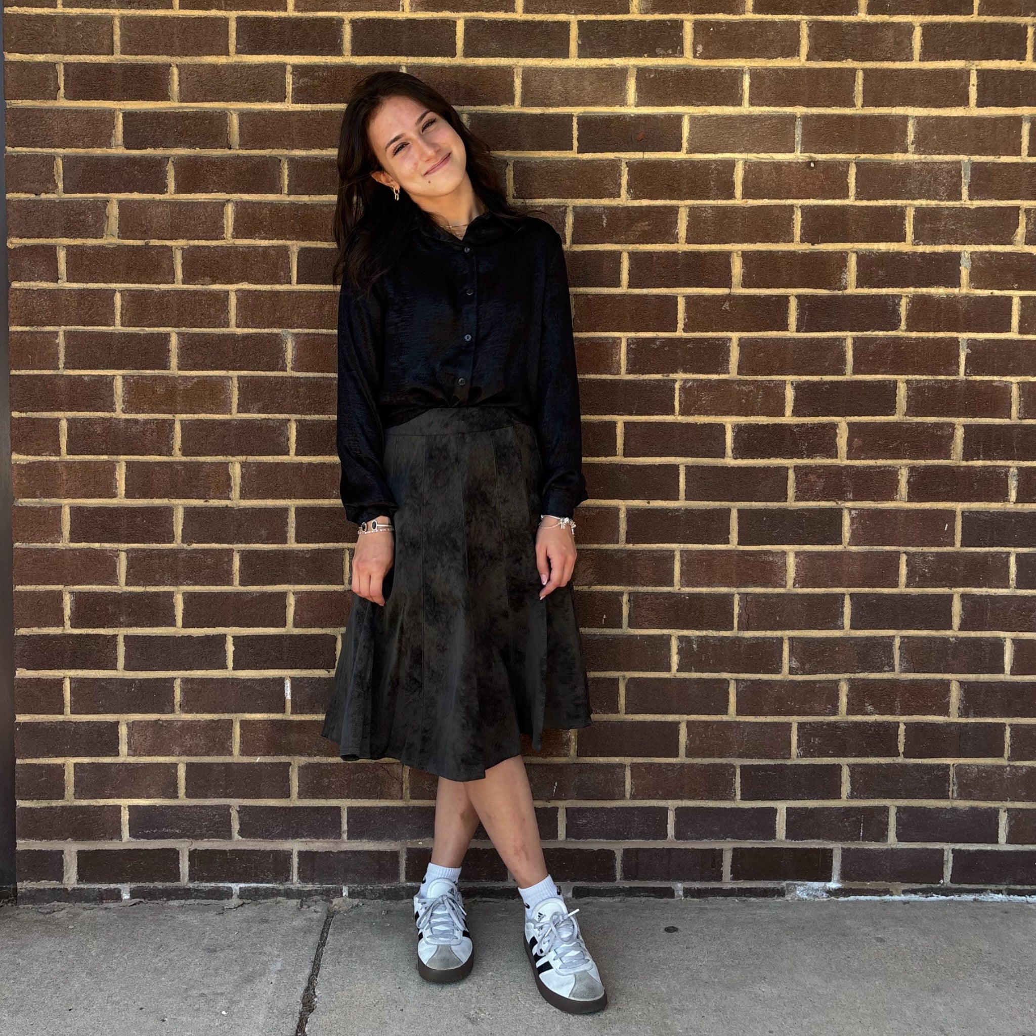 This faux distressed leather A-line skirt is a chic staple that pairs effortlessly with any look. Designed with soft, structured panels for a flattering shape, it offers both comfort and style. Perfect for dressing up with a blouse or keeping it casual with a cozy sweater. Unlined, side zip, no stretch, runs small.